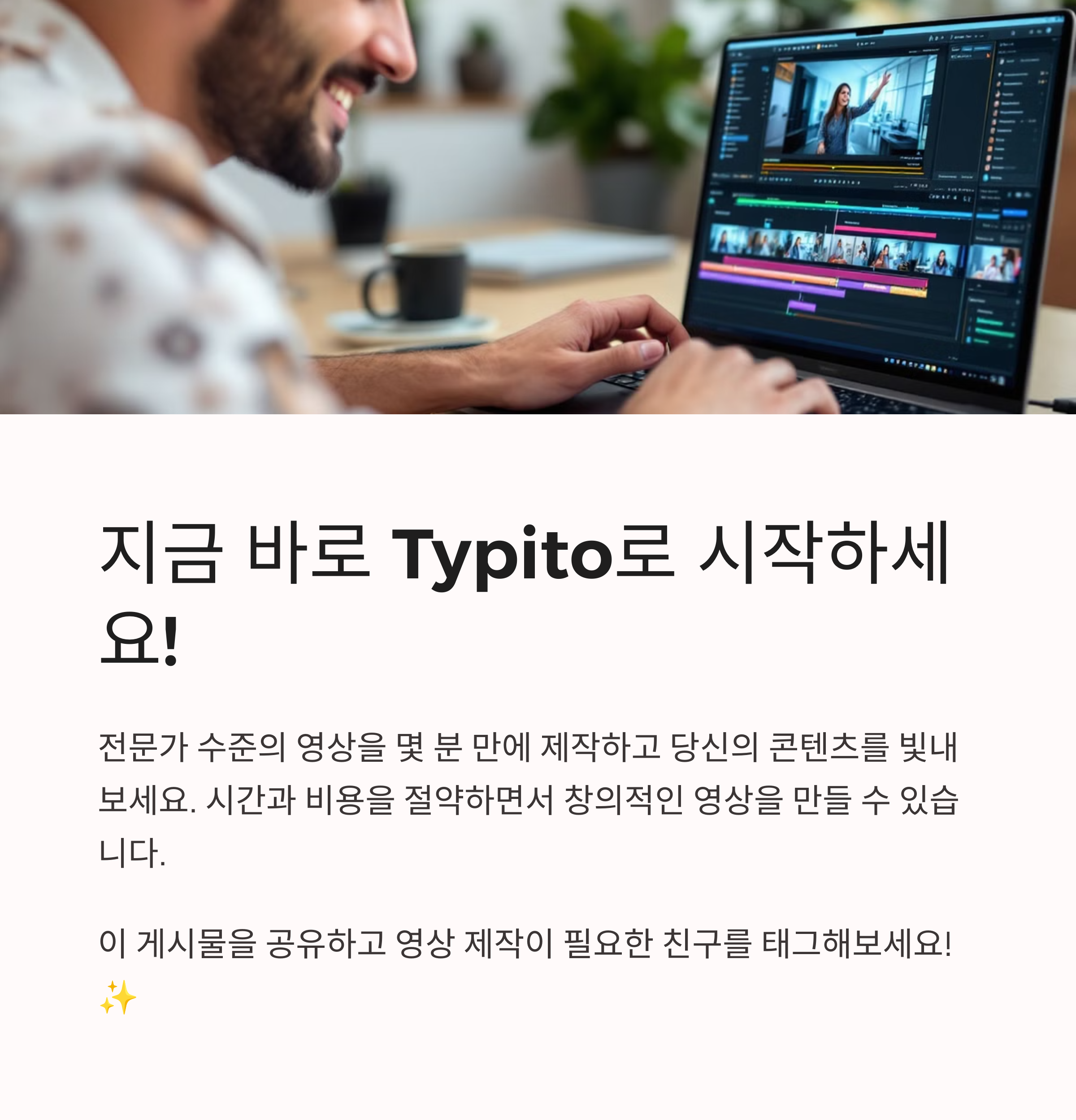 Typito는 단순한 영상 편집 툴을 넘어, 창작의 문턱을 낮추고 누구나 콘텐츠 크리에이터가 될 수 있게 해주는 플랫폼이에요. 저처럼 영상 편집에 자신 없던 분들도 Typito를 통해 손쉽게, 그리고 예쁘게 콘텐츠를 만들 수 있게 됐죠. 만약 아직도 영상 편집이 어렵다고 느껴진다면, Typito 한 번 써보세요. 아마 ‘왜 진작 몰랐지?’ 하실 수도 있어요! 😉 Typito로 시작하는 영상 제작, 지금 바로 도전해보는 건 어떨까요?