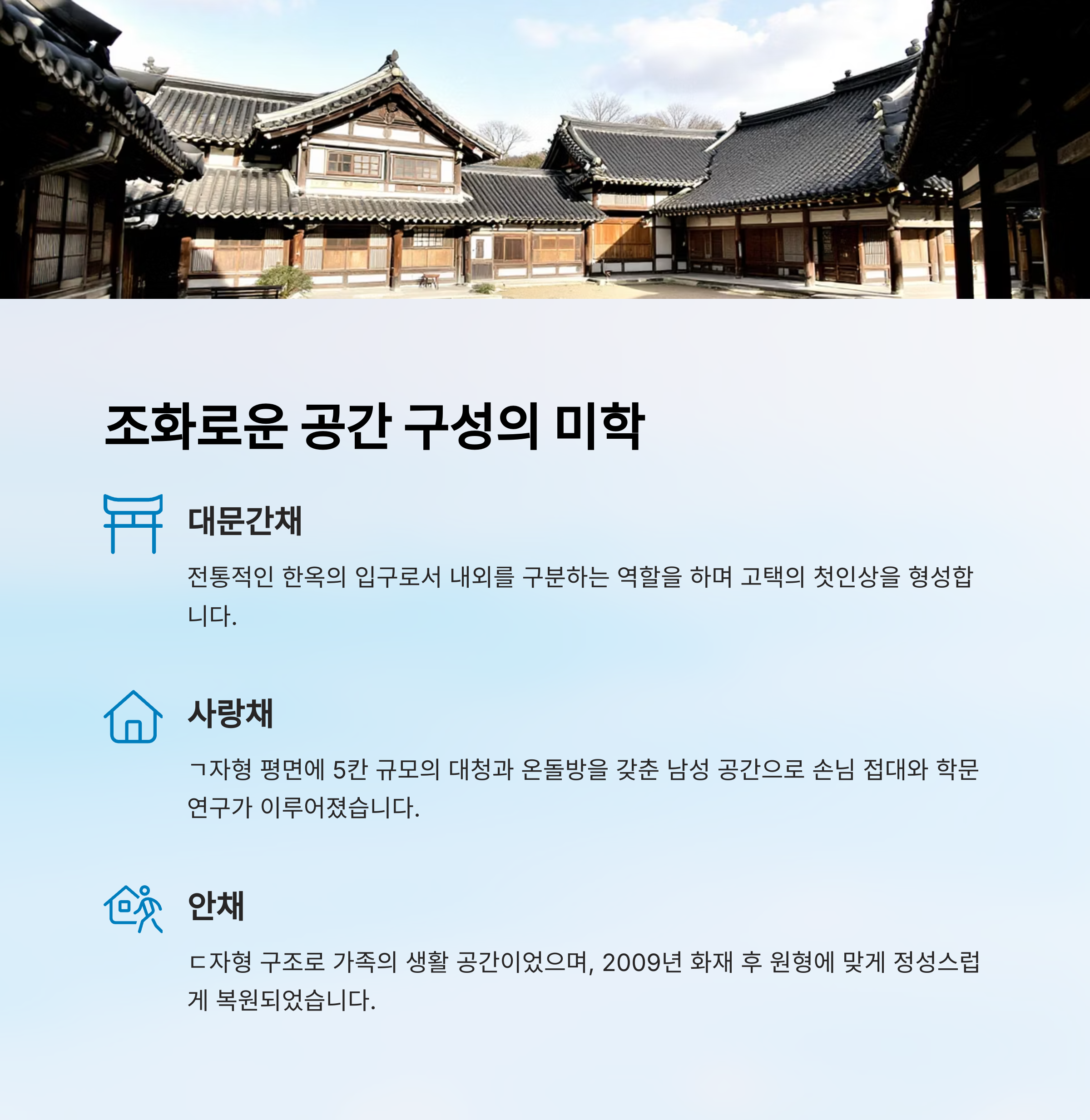 | 대문간채 | 4칸 | 1칸 | 곳간 2칸, 대문간 1칸, 온돌방 1칸 |