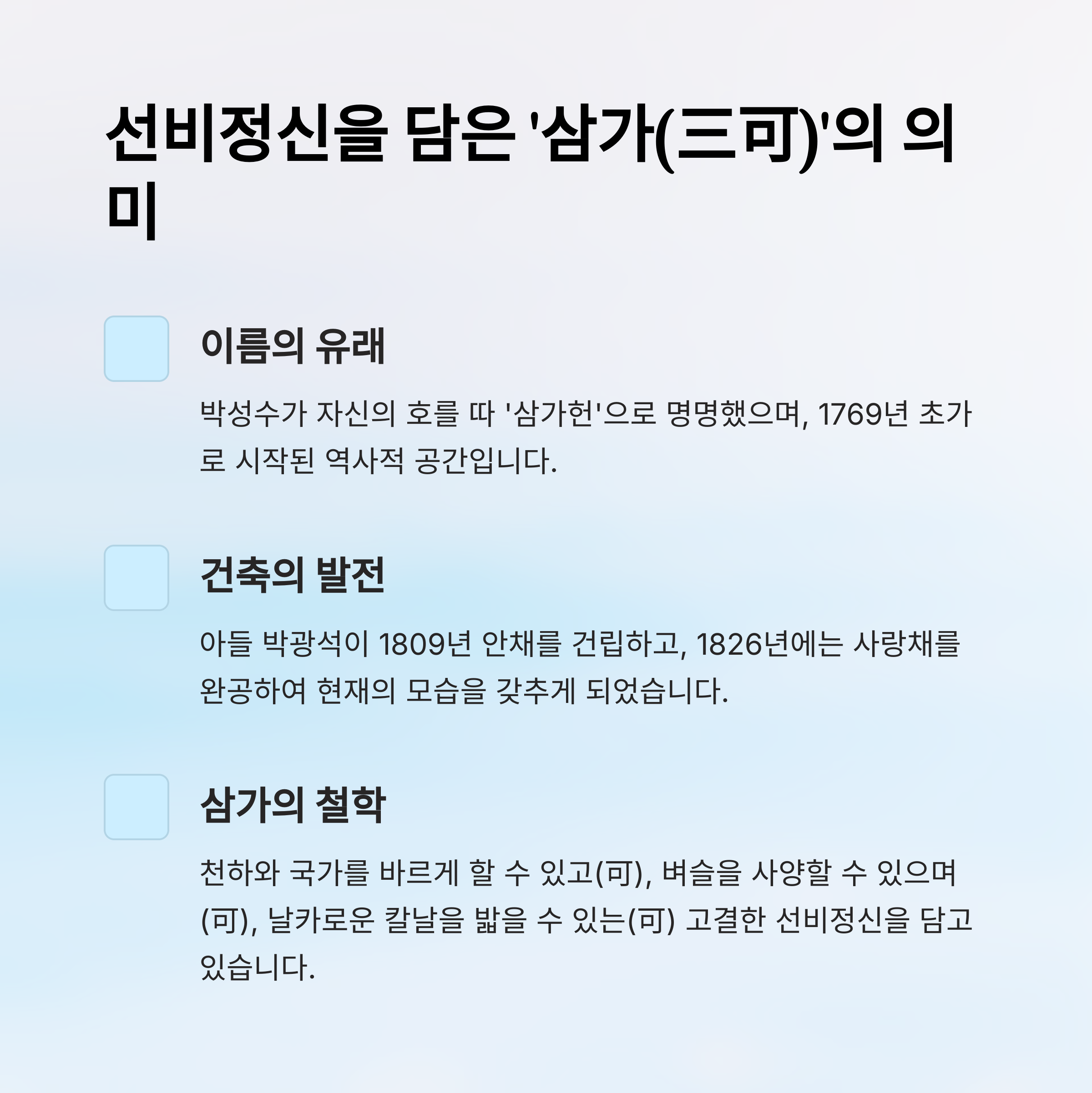 달성 삼가헌 고택의 시작은 조선 후기, 정확히는 1769년으로 거슬러 올라갑니다. 박팽년의 11대손인 박성수가 초가를 지으며 시작된 이 고택은 이후 대를 거쳐 안채, 사랑채, 별당채인 하엽정 등으로 확장되었죠. 특히 '삼가(三可)'라는 이름엔 선비의 정신이 깃들어 있어요. “천하를 바로잡을 수 있고, 벼슬을 사양할 수 있으며, 칼날을 밟을 수 있다”는 의미로, 고택의 정신적 기둥 같은 존재랍니다. 삼가헌은 단순한 집이 아닌, 박씨 집성촌의 정체성과 선비 문화의 살아있는 상징이에요.