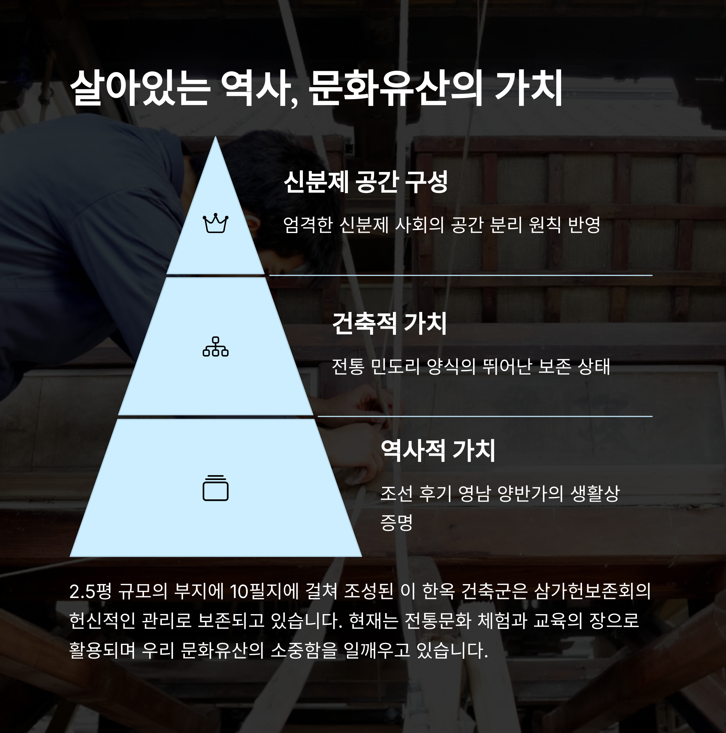 오늘날 삼가헌 고택은 단순한 관광지를 넘어서, 전통과 현대가 만나는 공간이 되었어요. 선비정신과 자연, 그리고 박씨 가문의 역사가 함께 어우러진 이 공간은 현대인에게 ‘쉼’과 ‘생각’의 여유를 제공합니다. 실제로 삼가헌은 지역민의 문화체험과 교육 장소로도 활용되며, 살아있는 문화유산으로 기능하고 있답니다.