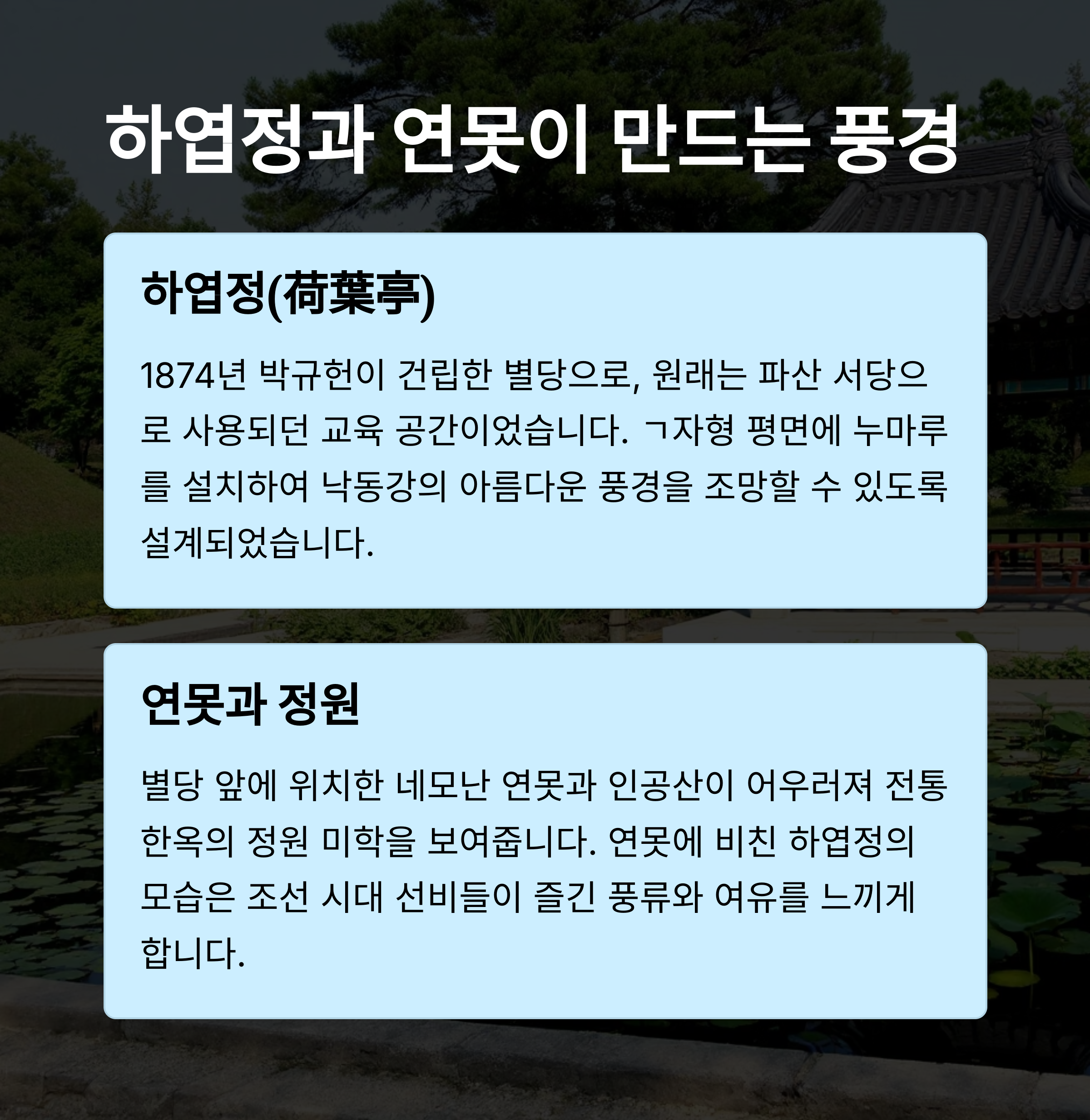 별당채(하엽정) 4칸 2칸 담장과 연못과 어우러진 풍류 공간