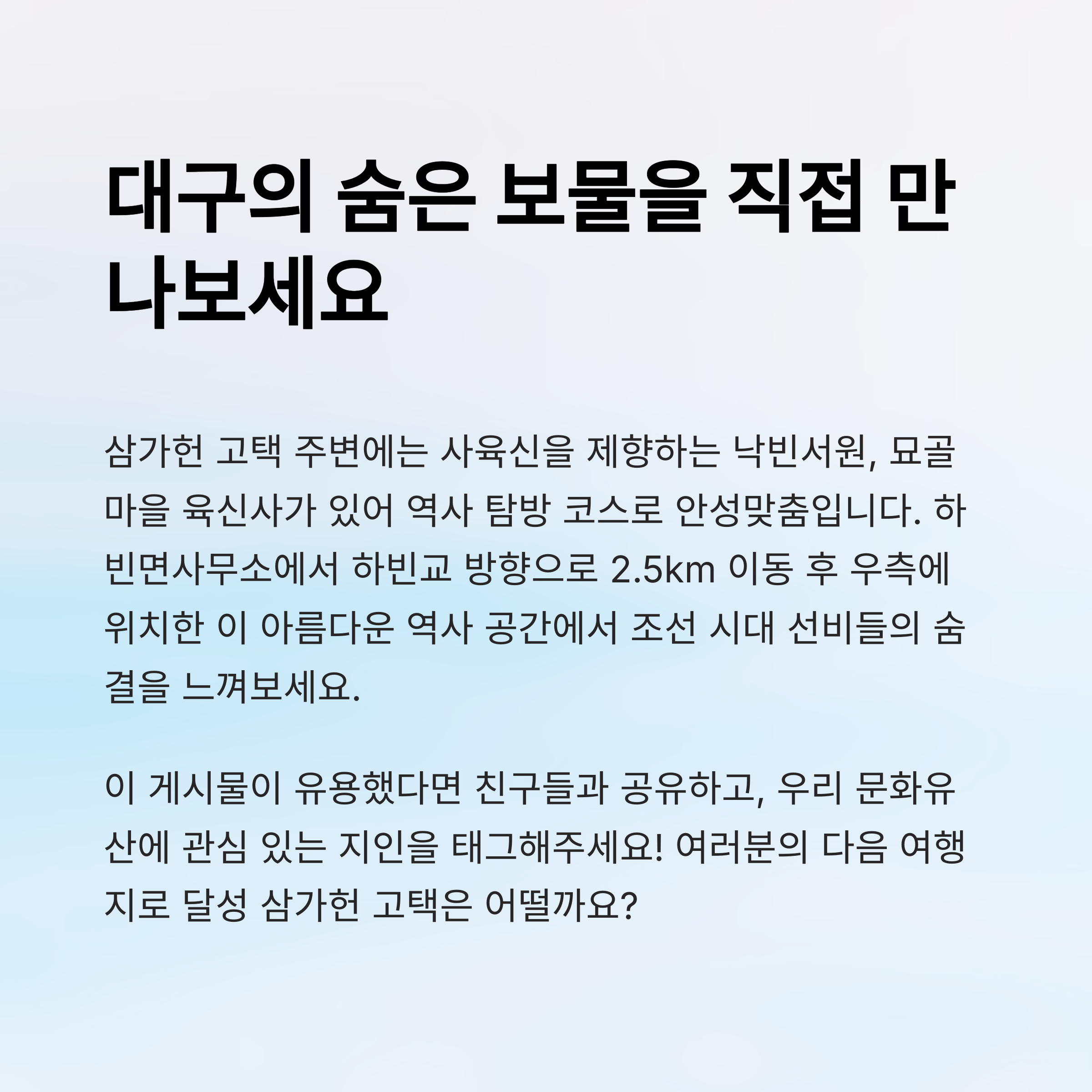 삼가헌 고택은 단순한 옛집이 아닙니다. 이곳을 거닐다 보면 조선의 선비가 되어 고요한 마당을 바라보는 기분이 들어요. 마음이 바쁜 요즘, 이런 공간이 있다는 것만으로도 위로가 되더라구요. 혹시나 복잡한 도시 생활에 지치셨다면, 잠시 짐을 내려놓고 삼가헌의 고즈넉함 속에서 쉼표 하나 찍어보시는 건 어떨까요? 여러분만의 감동을 이 고택에서 만나길 바래요. 😊