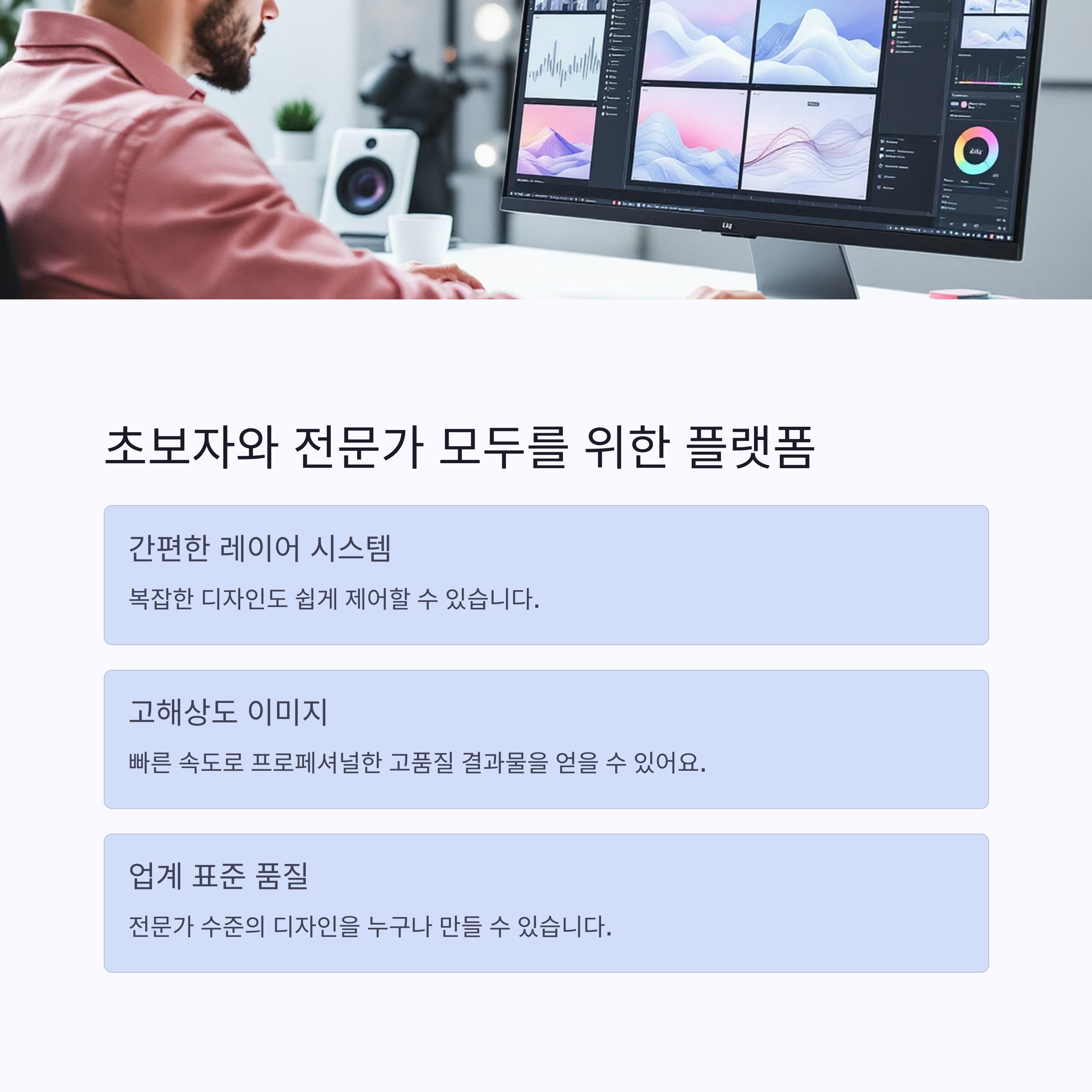 마케팅, 콘텐츠 제작, 쇼핑몰 운영, 디자인 샘플 제작 등 거의 모든 시각 콘텐츠 작업에 적합해요.