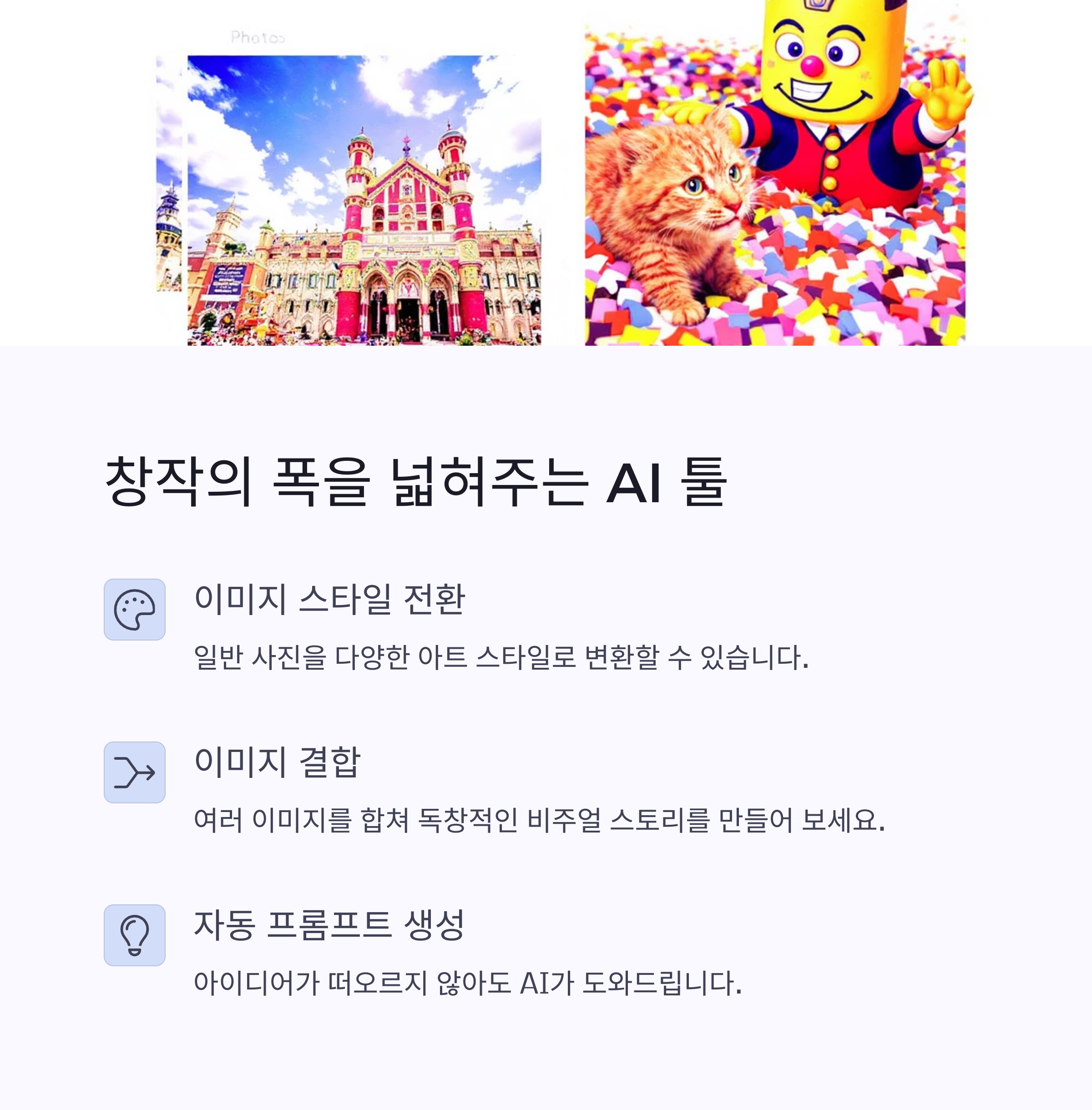 | 스타일 변환 | 사진을 만화, 수채화 등 다양한 스타일로 자동 변환 |
