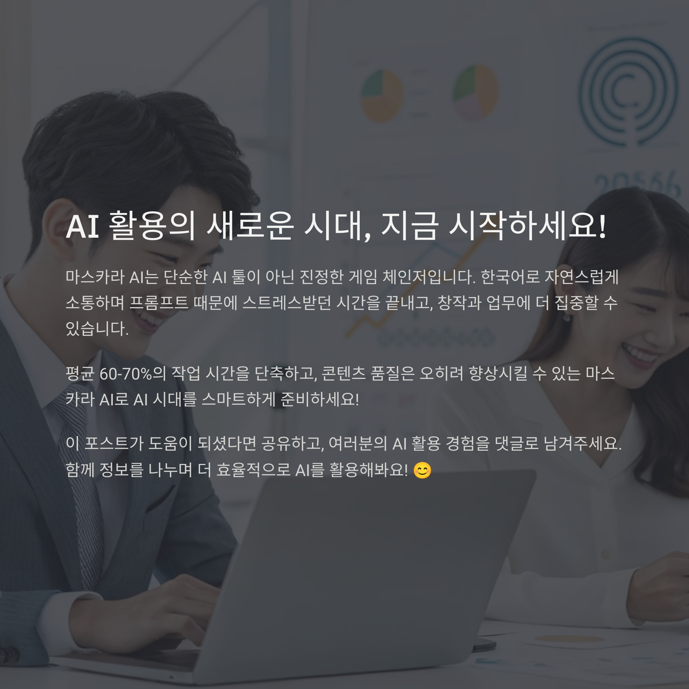 무엇보다 한국어로 자연스럽게 소통할 수 있다는 점이 정말 혁신적이라고 생각해요. 영어로 프롬프트 짜느라 고생하던 시절이 정말 옛날 이야기가 된 느낌이에요. 여러분도 AI와 친해지고 싶다면, 마스카라 AI부터 시작해보시는 걸 진심으로 추천드려요!