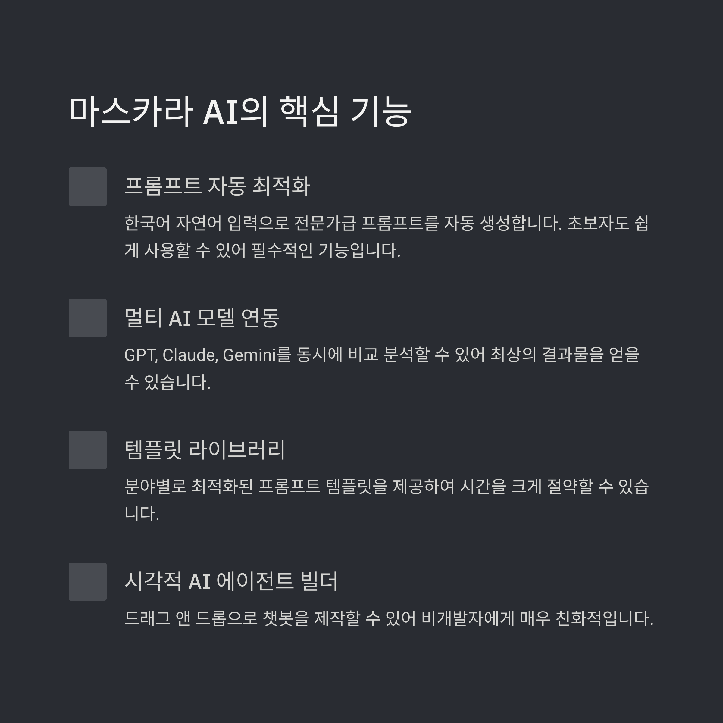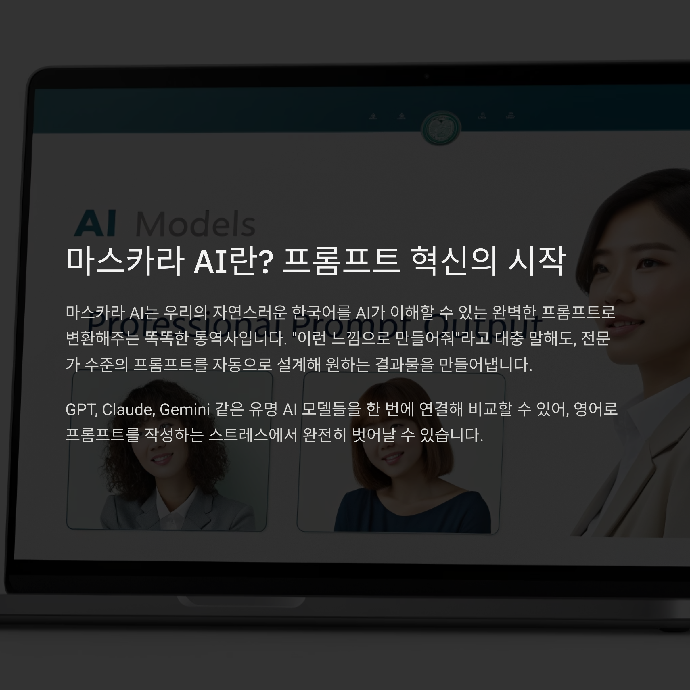 마스카라 AI는 쉽게 말해서 우리의 말을 AI가 이해할 수 있는 완벽한 언어로 번역해주는 똑똑한 통역사 같은 존재예요. "이런 느낌으로 만들어줘"라고 대충 말해도, AI가 알아서 전문가 수준의 프롬프트를 설계해서 원하는 결과물을 뚝딱 만들어내죠. 더 놀라운 건 GPT, Claude, Gemini 같은 유명한 AI 모델들을 한 번에 연결해서 비교해볼 수 있다는 점이에요.