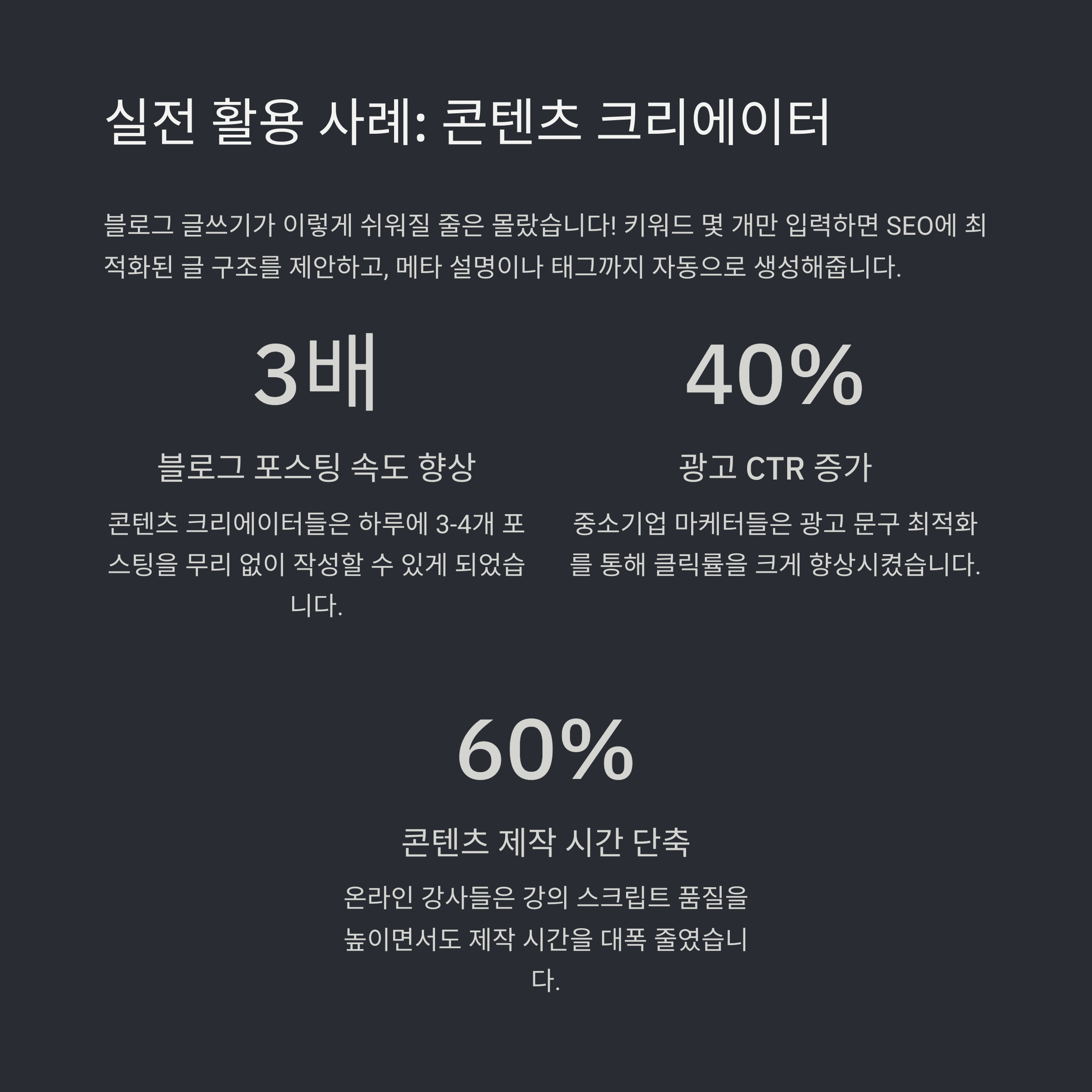 | 온라인 강사 | 강의 스크립트 품질 향상 | 콘텐츠 제작 60% 단축 |