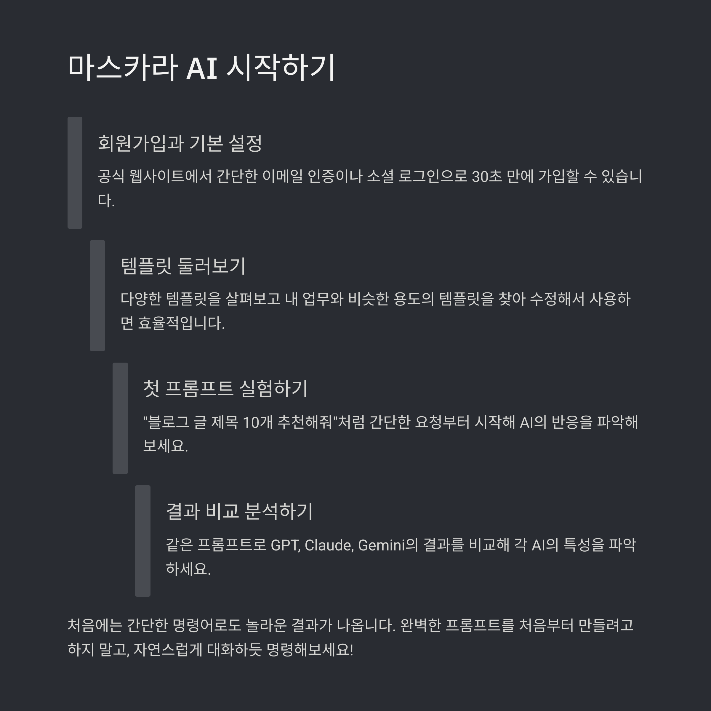 처음엔 "이런 걸로도 되나?" 싶을 정도로 간단한 명령어로도 놀라운 결과가 나와요. 중요한 건 완벽한 프롬프트를 처음부터 만들려고 하지 말고, 마스카라 AI의 자동 최적화 기능을 믿고 자연스럽게 대화하듯 명령해보는 거예요!