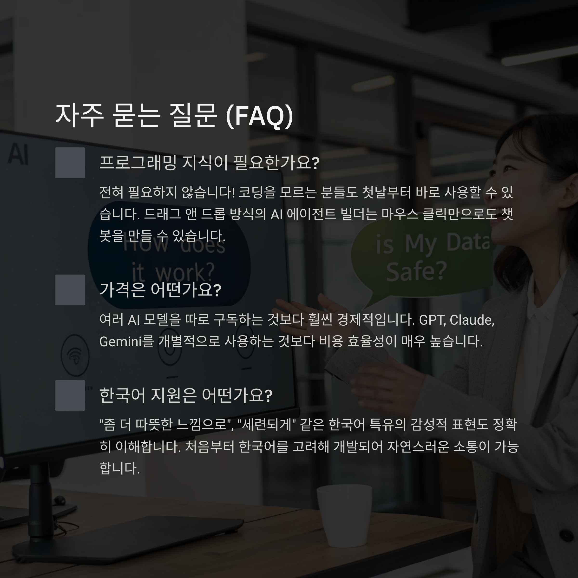 전혀 필요하지 않아요! 저도 코딩을 전혀 모르는데 첫날부터 바로 사용할 수 있었어요. 특히 드래그 앤 드롭 방식의 AI 에이전트 빌더는 정말 직관적이라서, 마우스 클릭만으로도 나만의 챗봇을 만들 수 있답니다.