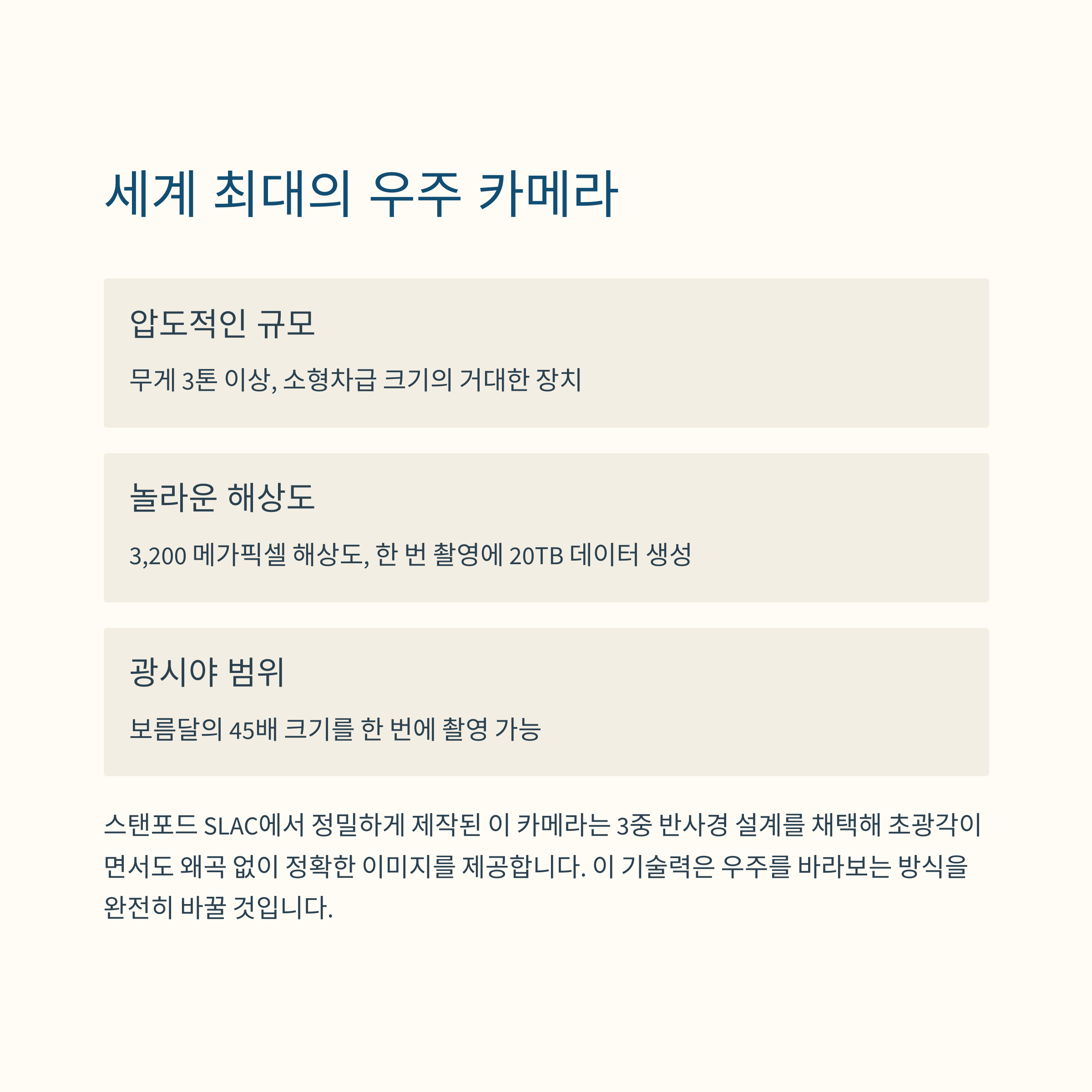 카메라가 정말 기가 막혀요. 무게만 해도 3톤이 넘고, 크기는 거의 소형차급이에요. 이 거대한 장치는 스탠포드 SLAC에서 정밀하게 제작되었고, 3중 반사경 설계를 채택해 초광각이면서도 왜곡 없이 정확한 이미지를 제공합니다.