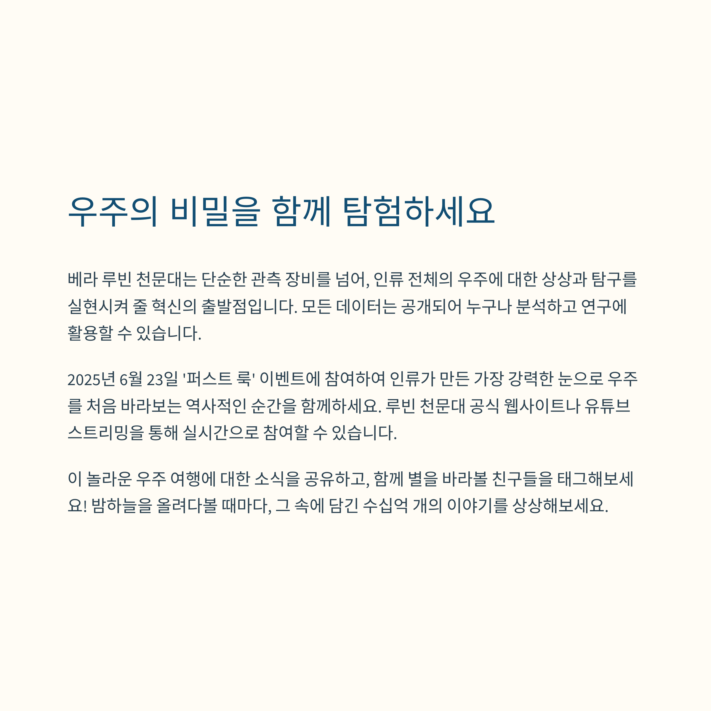 우리는 지금, 우주를 바라보는 새로운 ‘눈’을 가지게 되었습니다. 베라 루빈 천문대는 단순한 관측 장비를 넘어, 인류 전체의 우주에 대한 상상과 탐구를 실현시켜 줄 혁신의 출발점이에요. 이 엄청난 여정이 시작되는 지금, 여러분도 함께 하실 준비 되셨나요? 밤하늘을 올려다볼 때, 이제 그 속에는 수십억 개의 이야기가 담겨 있을지도 몰라요. 앞으로 이 천문대가 우리에게 어떤 새로운 질문과 답을 던져줄지, 무척 기대되지 않으세요?