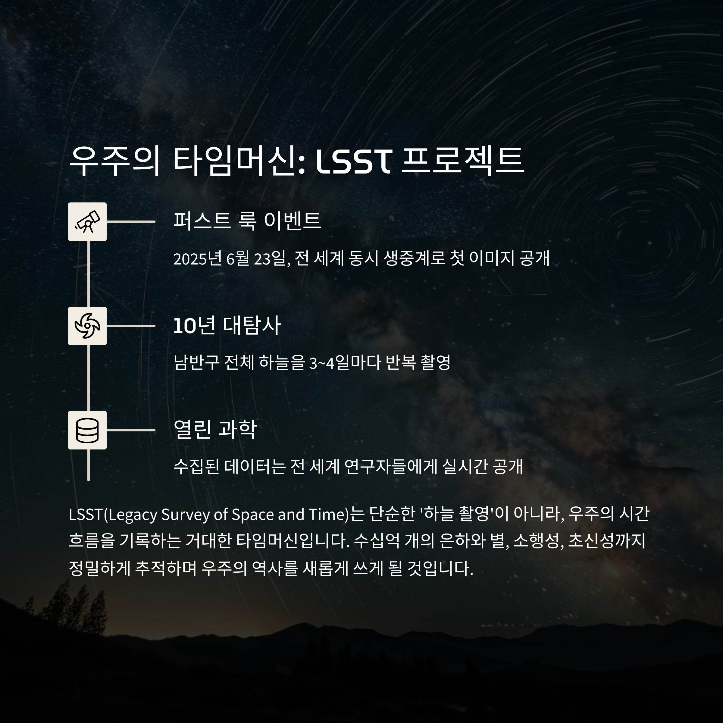 LSST(Legacy Survey of Space and Time)는 루빈 천문대의 핵심 프로젝트예요. 이 프로젝트는 단순한 ‘하늘 촬영’이 아니라, 우주의 시간 흐름을 기록하는 거대한 타임머신과도 같아요. 10년 동안 남반구 전체 하늘을 3~4일마다 반복 촬영하며, 수십억 개의 은하와 별, 소행성, 초신성까지 정밀하게 추적합니다. 이 데이터는 전 세계 연구자들에게 실시간으로 공개되어, 진정한 ‘열린 과학(Open Science)’의 시대를 여는 역할을 하게 됩니다.