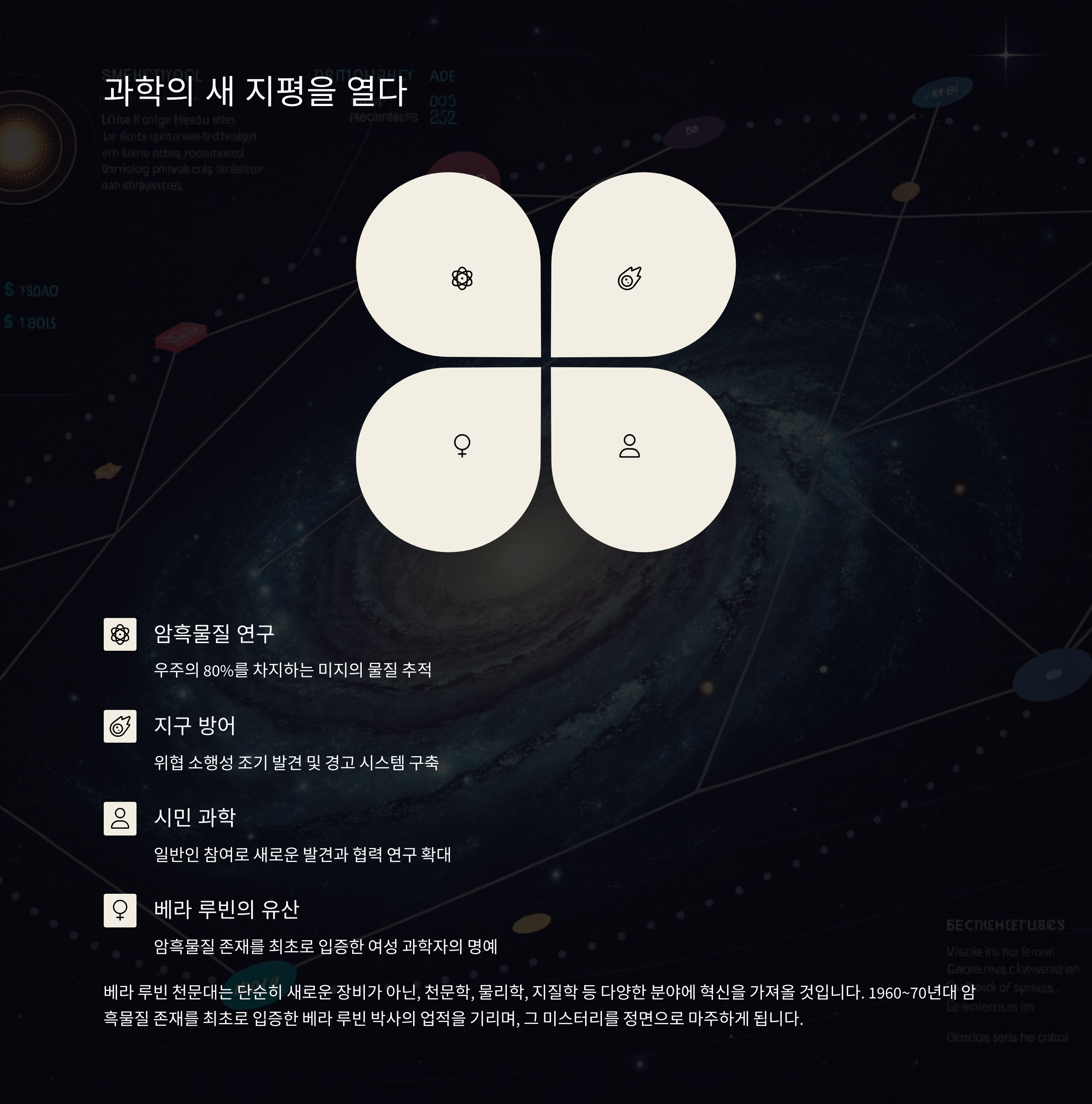 1960~70년대, 루빈 박사는 은하 회전 곡선을 관측하며 암흑물질 존재를 최초로 입증했습니다. 그리고 지금, 그녀의 이름을 딴 천문대는 그 미스터리를 정면으로 마주하고 있어요.