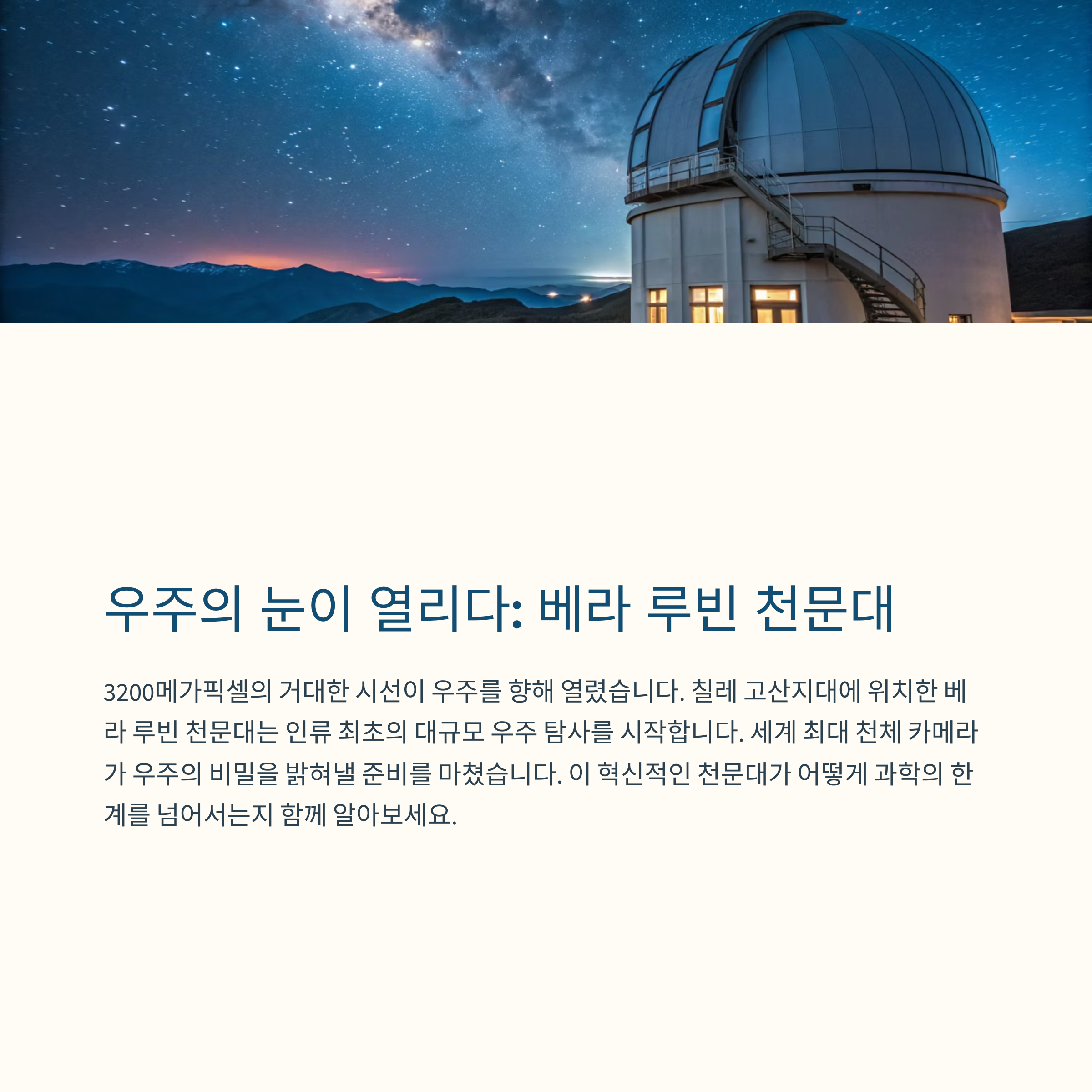 안녕하세요, 밤하늘을 바라보며 무한한 상상에 빠지는 걸 좋아하는 저로선, 이번 소식이 정말 가슴 벅차게 다가왔어요. 칠레의 고산지대에서 세계 최대 천체 카메라가 우주를 향해 눈을 떴다니, 이보다 더 드라마틱한 이야기가 있을까요? 과학은 정말 영화보다 더 영화 같다는 걸 또 한 번 느끼게 해주는 순간이에요. 이제 우주에 대한 우리의 이해는 새로운 시대를 맞이하게 될 것 같아요. 오늘은 베라 루빈 천문대가 우리에게 어떤 의미를 가지는지, 그리고 앞으로 어떤 혁신이 펼쳐질지 함께 들여다보려 해요. 이 흥미로운 여정, 저와 함께 하시죠!