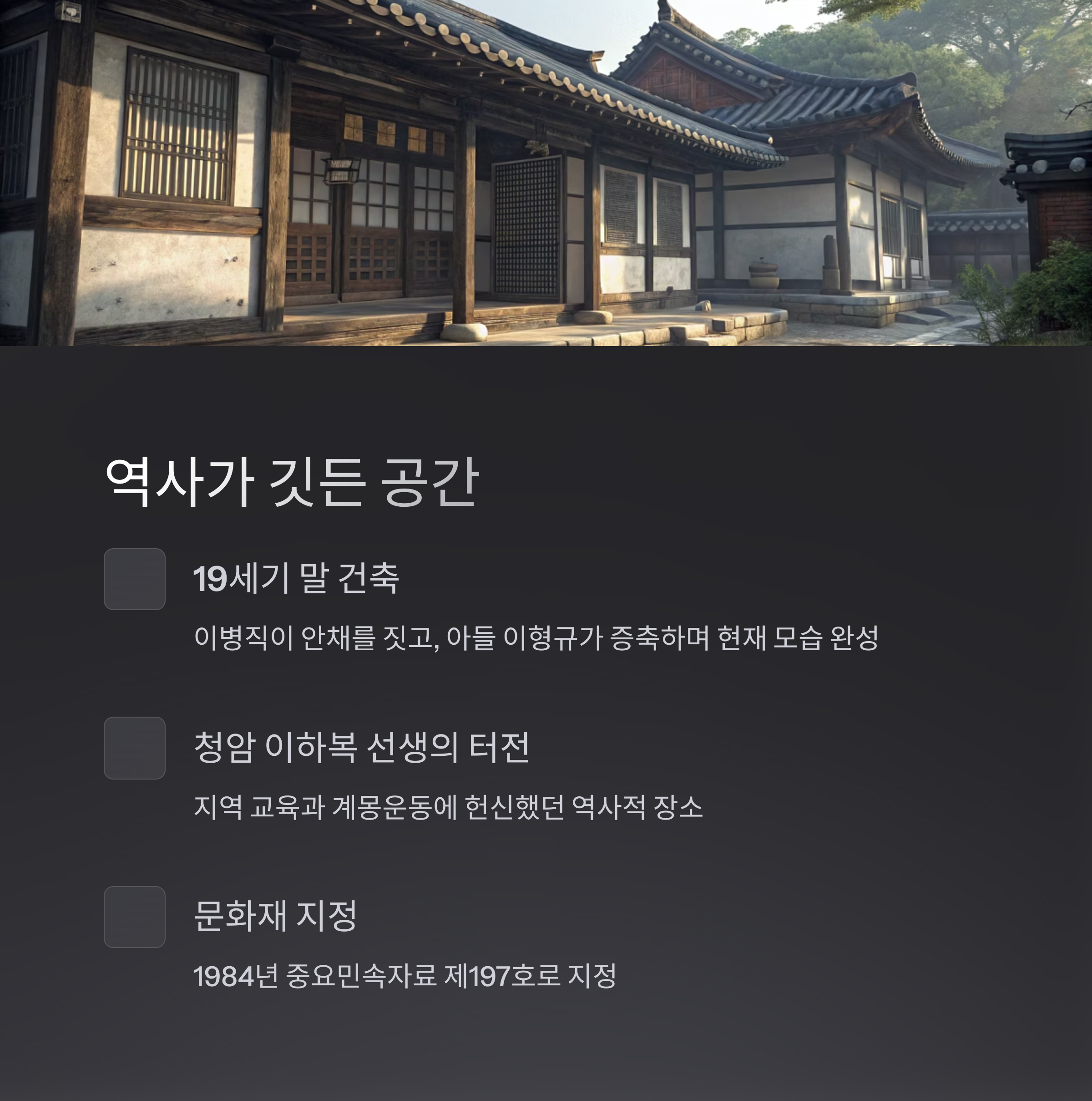 청암문화재단의 운영 하에, 이하복 고택은 단순히 관람하는 장소를 넘어 살아 숨 쉬는 체험형 공간으로 거듭났습니다. 전통한옥 숙박, 농촌 체험, 전통복 체험, 사진촬영, 그리고 교육 중심 프로그램 등 다양한 콘텐츠가 준비되어 있어, 가족 단위나 단체 여행객 모두에게 유익한 시간을 제공합니다.