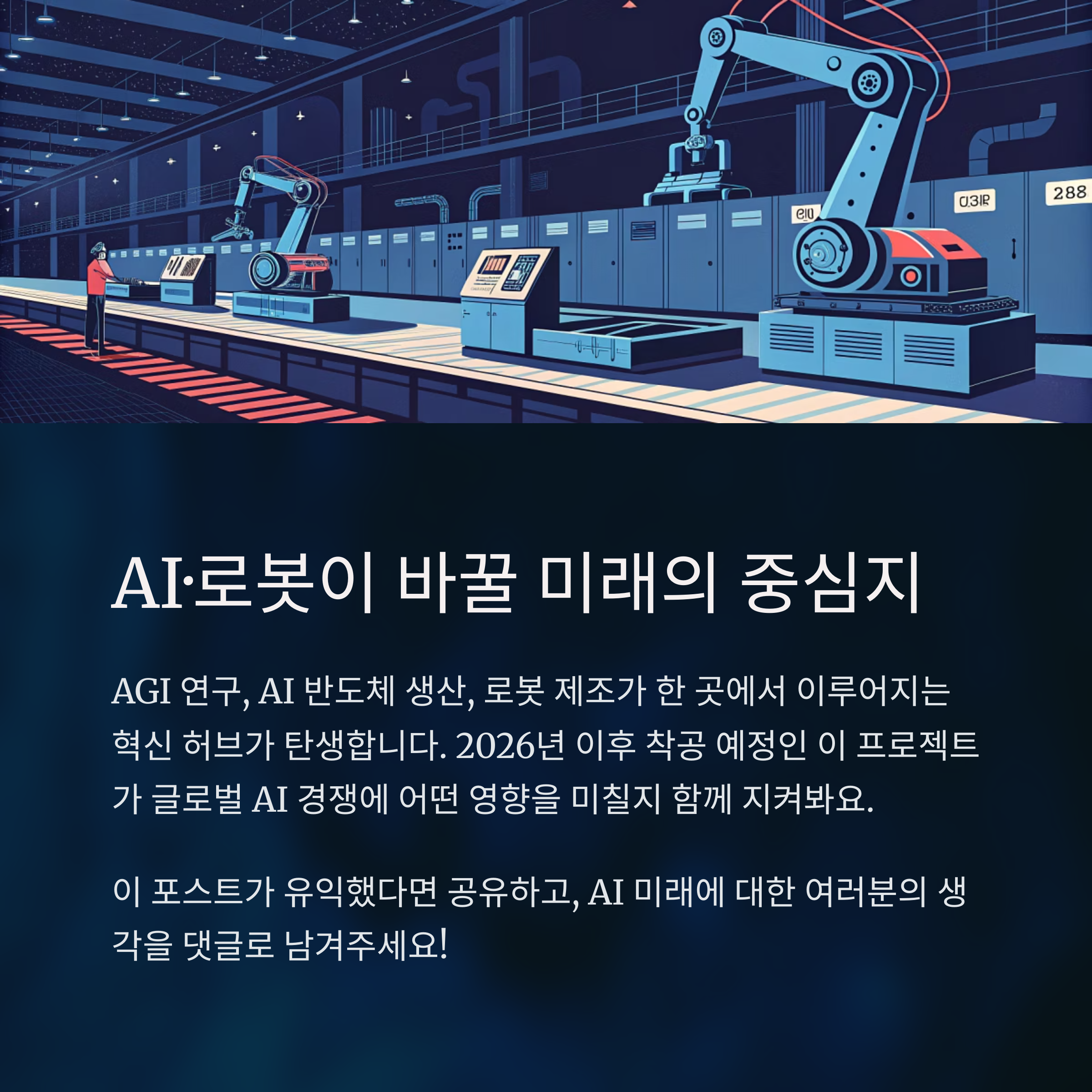 이 프로젝트가 단순한 인프라 건설에 그치지 않는 이유는, 전 세계 AI·로봇 산업에 미칠 영향이 엄청나기 때문입니다. AGI(범용 인공지능) 연구, AI 반도체 생산, 로봇 제조까지 한 곳에 모이는 구조니까요. 혁신과 생산이 동시에 이루어질 수 있는 진짜 허브가 탄생하는 거죠.