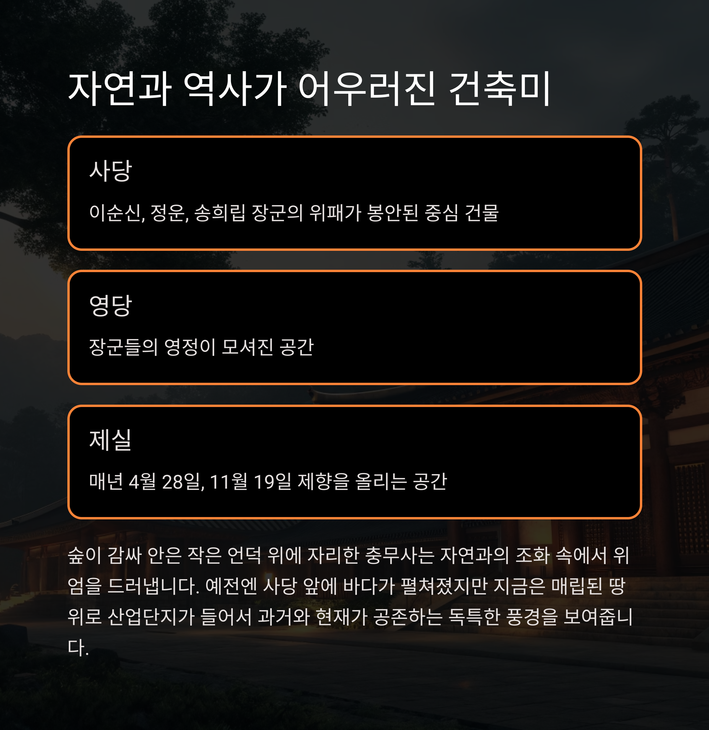 숲이 감싸 안은 작은 언덕 위에 자리한 충무사는 자연과의 조화 속에서 위엄을 드러냅니다. 예전엔 사당 앞에 바다가 펼쳐졌지만 지금은 매립된 땅 위로 산업단지가 들어섰죠. 과거와 현재가 공존하는 이 풍경, 정말 독특해요.
