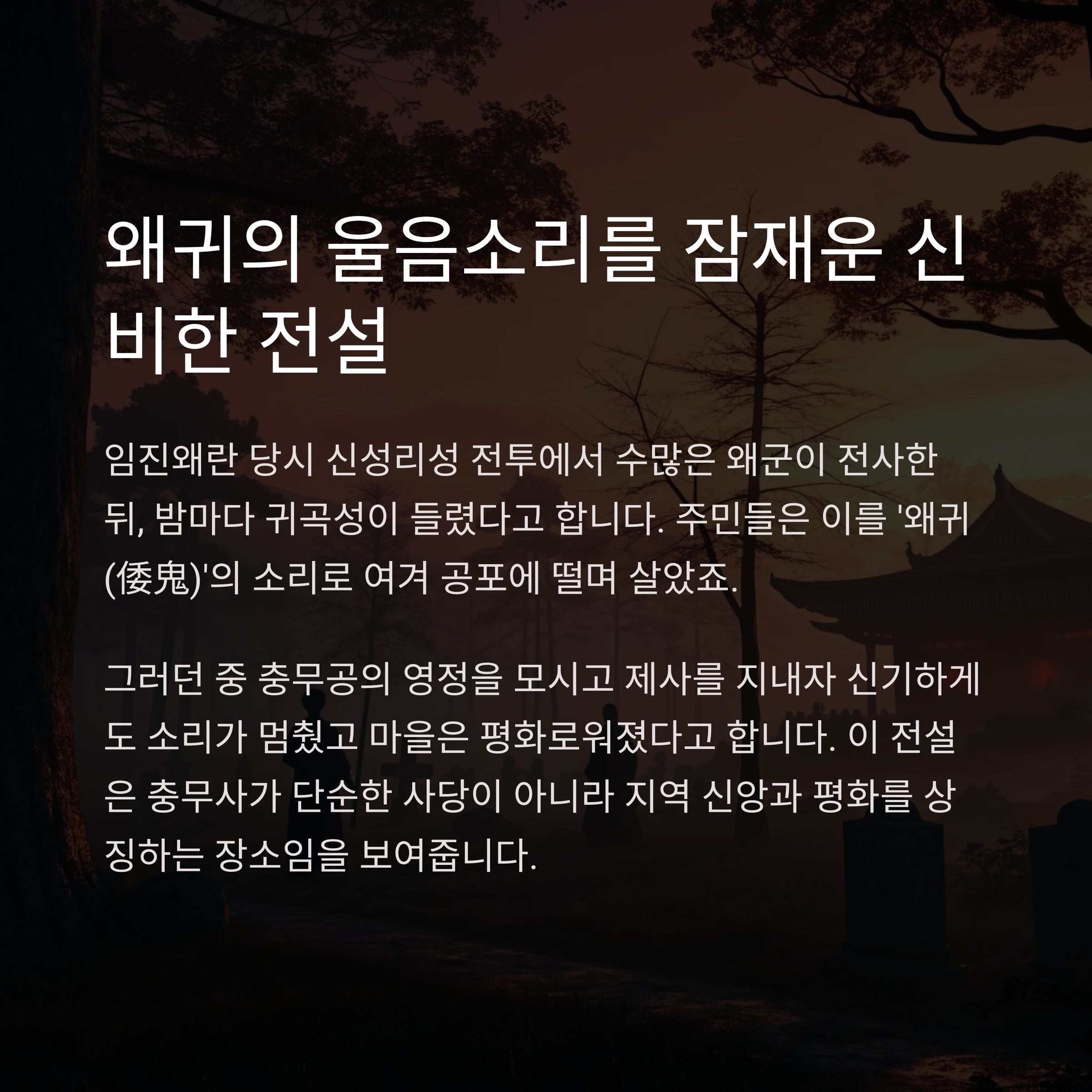 순천 충무사에는 흥미로운 전설이 전해져 내려옵니다. 임진왜란 당시 신성리성 전투에서 수많은 왜군이 전사한 뒤, 밤마다 귀곡성이 들렸다는 거죠. 주민들은 이를 ‘왜귀(倭鬼)’의 소리로 여겼고, 공포에 떨며 살았다고 해요. 그런 중에 충무공의 영정을 모시고 제사를 지내자 신기하게도 소리가 멈췄고 마을은 평화로워졌다는 이야기입니다. 이 전설은 충무사가 단순한 사당이 아니라 지역 신앙과 평화를 상징하는 장소임을 보여줍니다.