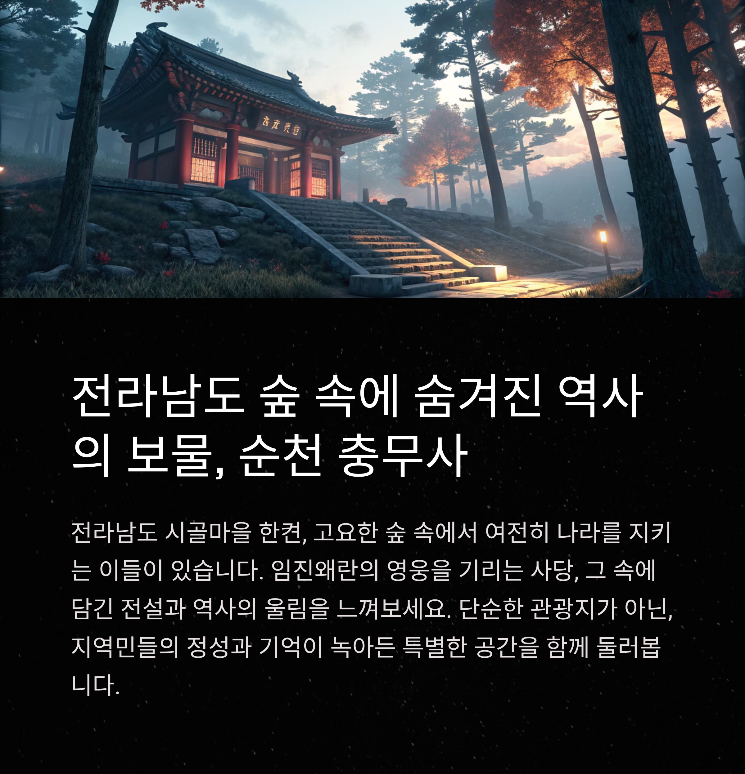 안녕하세요, 여러분! 저는 얼마 전 전라남도 순천으로 짧은 여행을 다녀왔는데요, 그 중 가장 기억에 남는 곳이 바로 ‘충무사’였습니다. 사실 이순신 장군을 기리는 사당이야 여기저기 많지만, 순천 충무사만큼 조용하고 깊은 울림을 주는 곳은 처음이었어요. 그냥 사당이 아니라, 지역민들의 정성과 기억, 그리고 전설까지 녹아든 공간이더라고요. 바쁘고 시끄러운 일상 속에서 문득 고요함이 그리울 때, 이곳이 얼마나 위로가 되는지 직접 느껴보시면 좋을 것 같아서 이렇게 소개하게 되었어요.