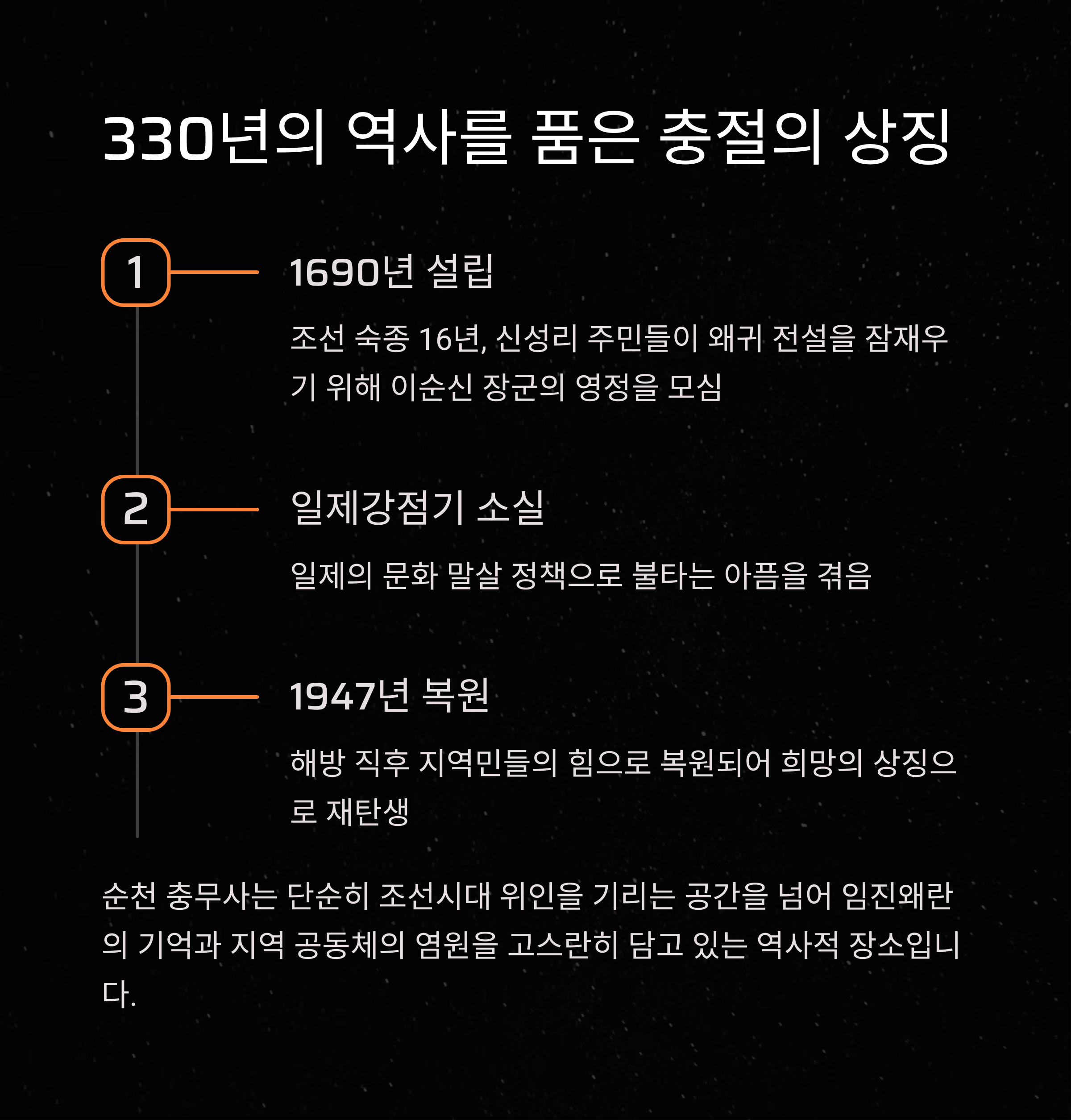 순천 충무사는 단순히 조선시대 위인을 기리는 공간을 넘어선 존재예요. 1690년, 조선 숙종 16년에 신성리 주민들이 왜귀 전설을 잠재우기 위해 이순신 장군의 영정을 모시며 시작된 이 사당은 임진왜란의 기억과 지역 공동체의 염원을 고스란히 담고 있죠. 하지만 이 충절의 상징은 일제강점기 때 일제의 문화 말살 정책으로 불타는 아픔을 겪기도 했어요. 다행히 1947년 해방 직후, 지역민들의 힘으로 복원되었고요. 지금 우리가 보는 충무사는 그렇게 되살아난 희망의 상징입니다.