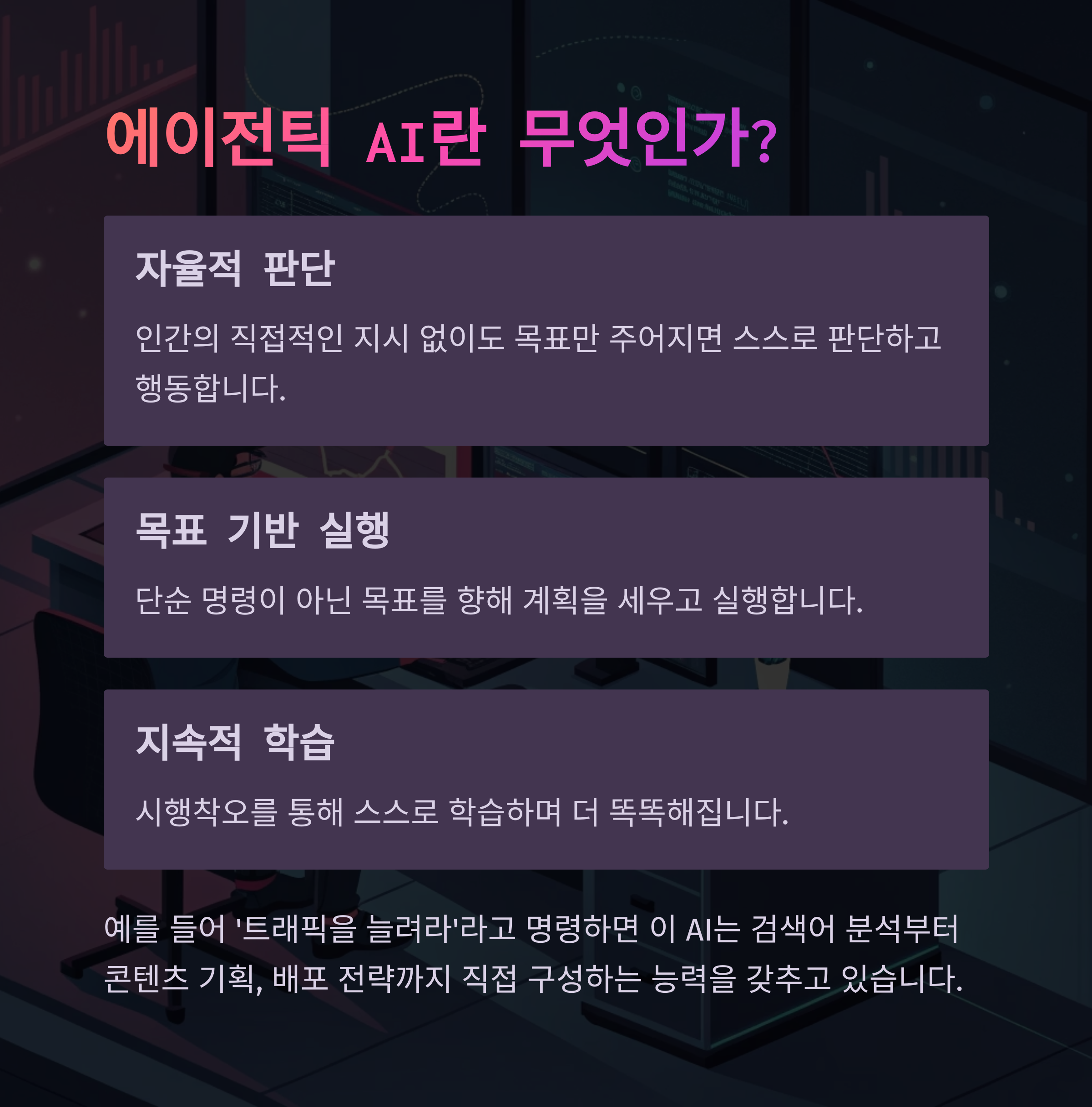 에이전틱 AI는 말 그대로 ‘에이전트(Agent)’처럼 스스로 판단하고 실행하는 능력을 가진 인공지능을 말합니다. 기존 AI가 단순히 데이터를 기반으로 결과를 도출하는 '반응형'이라면, 에이전틱 AI는 ‘행동하는’ 존재예요. 인간이 직접 하나하나 지시하지 않아도, 목표만 정해주면 나머지는 스스로 판단하고 계획을 짜고 행동까지 합니다. 예를 들어 ‘트래픽을 늘려라’라고 명령하면 이 AI는 검색어 분석부터 콘텐츠 기획, 배포 전략까지 직접 구성하는 거죠. 정말 놀랍지 않나요?