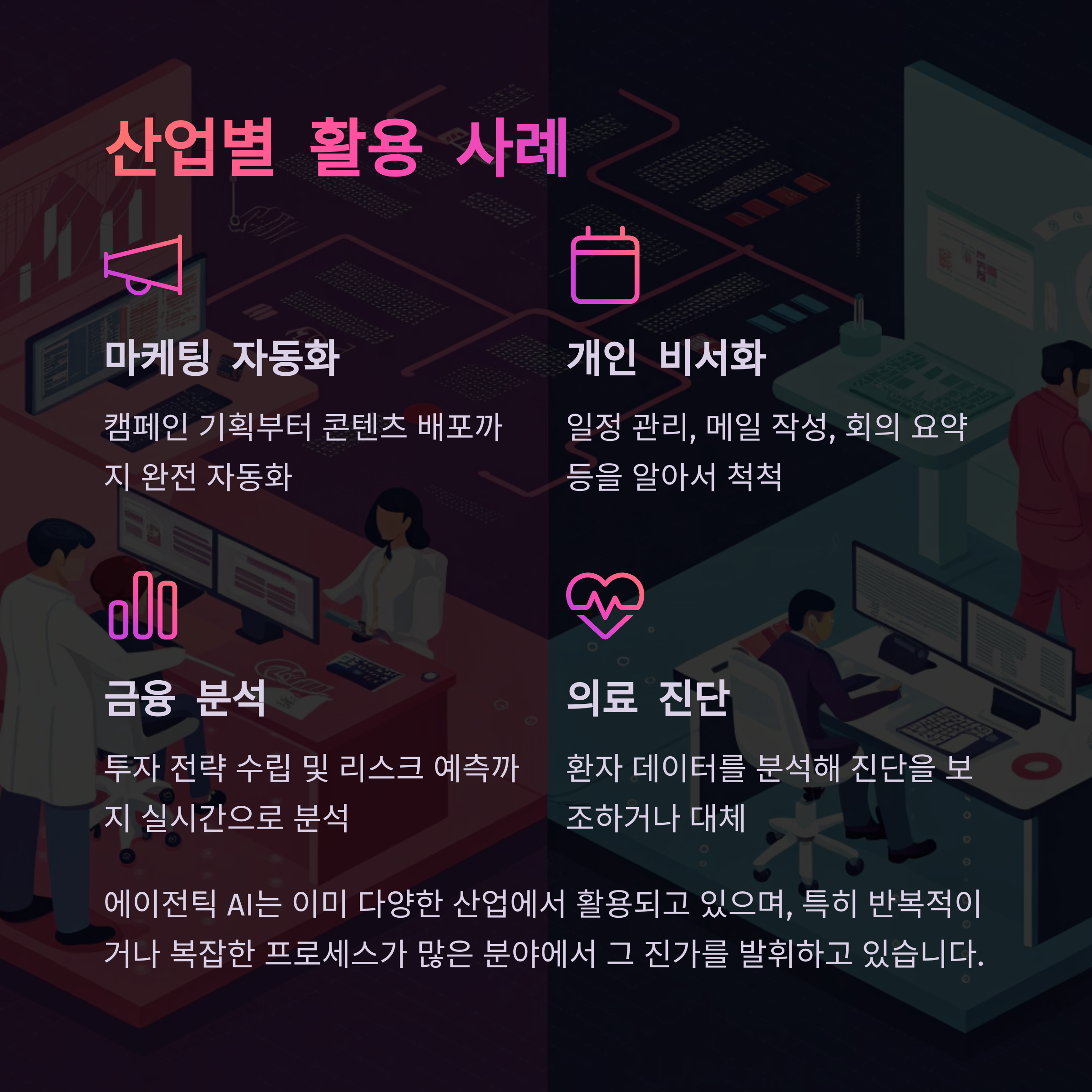 에이전틱 AI는 이론 속 기술이 아닙니다. 이미 여러 산업에서 활용되며 눈에 띄는 성과를 만들어내고 있어요. 특히 반복적이거나 복잡한 프로세스가 많은 분야일수록 그 진가가 빛납니다.