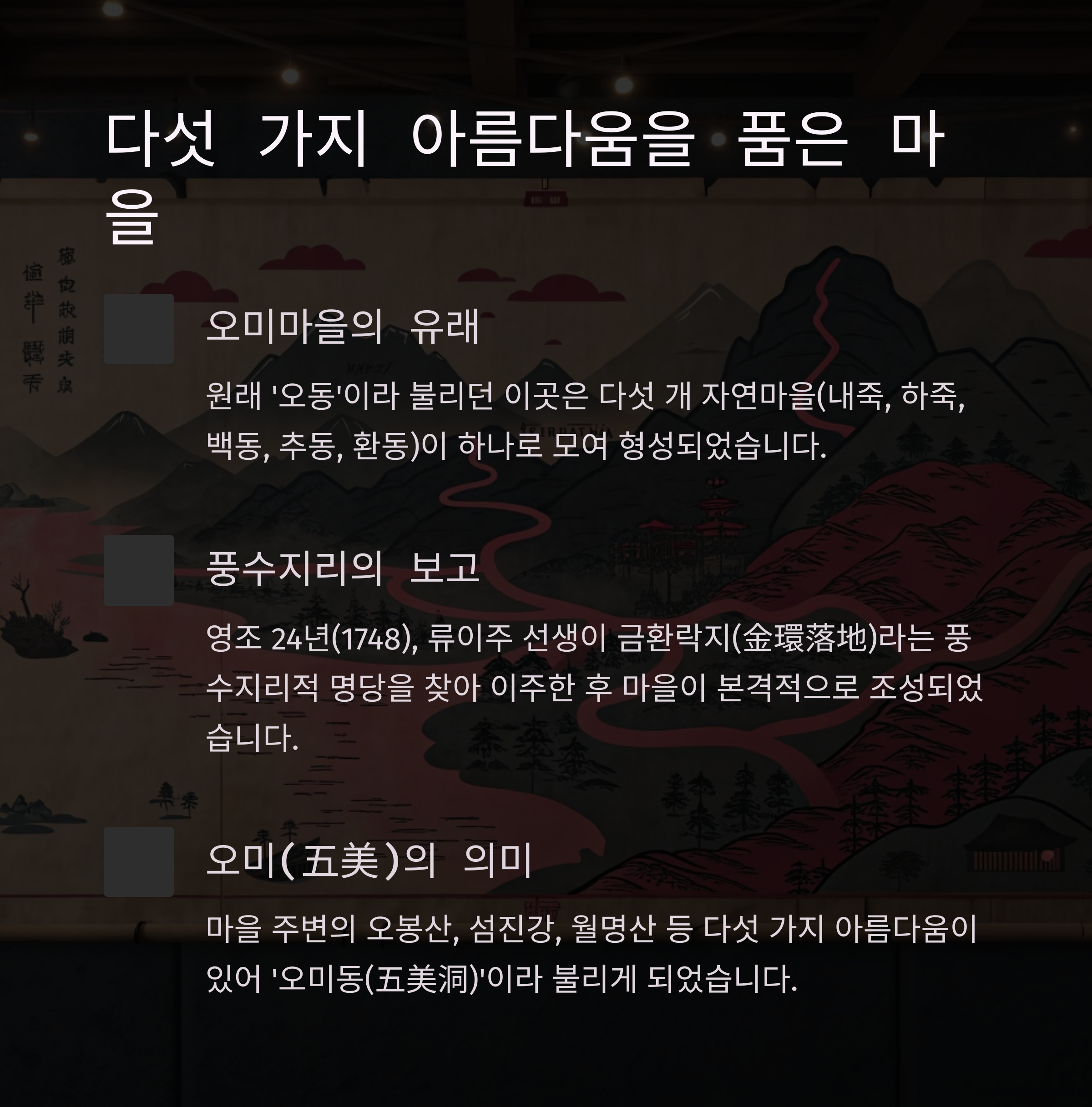 오미마을은 단순한 관광지가 아니라, 조선시대부터 이어져 내려온 역사 깊은 터전이에요. 원래 이름은 '오동'이었는데요, 내죽, 하죽, 백동, 추동, 환동이라는 다섯 개 자연마을이 하나로 모여 형성되었답니다. 영조 24년(1748), 삼수부사를 지낸 류이주 선생이 금환락지(金環落地)라는 풍수지리적 명당을 찾아 이주한 이후 본격적으로 마을이 조성되었죠. 그리고 이 마을 주변에는 오봉산, 섬진강, 월명산 등 다섯 가지 아름다움이 있어서 '오미동(五美洞)'이라 불리게 되었어요. 이름 자체가 풍경을 담고 있는 거죠.