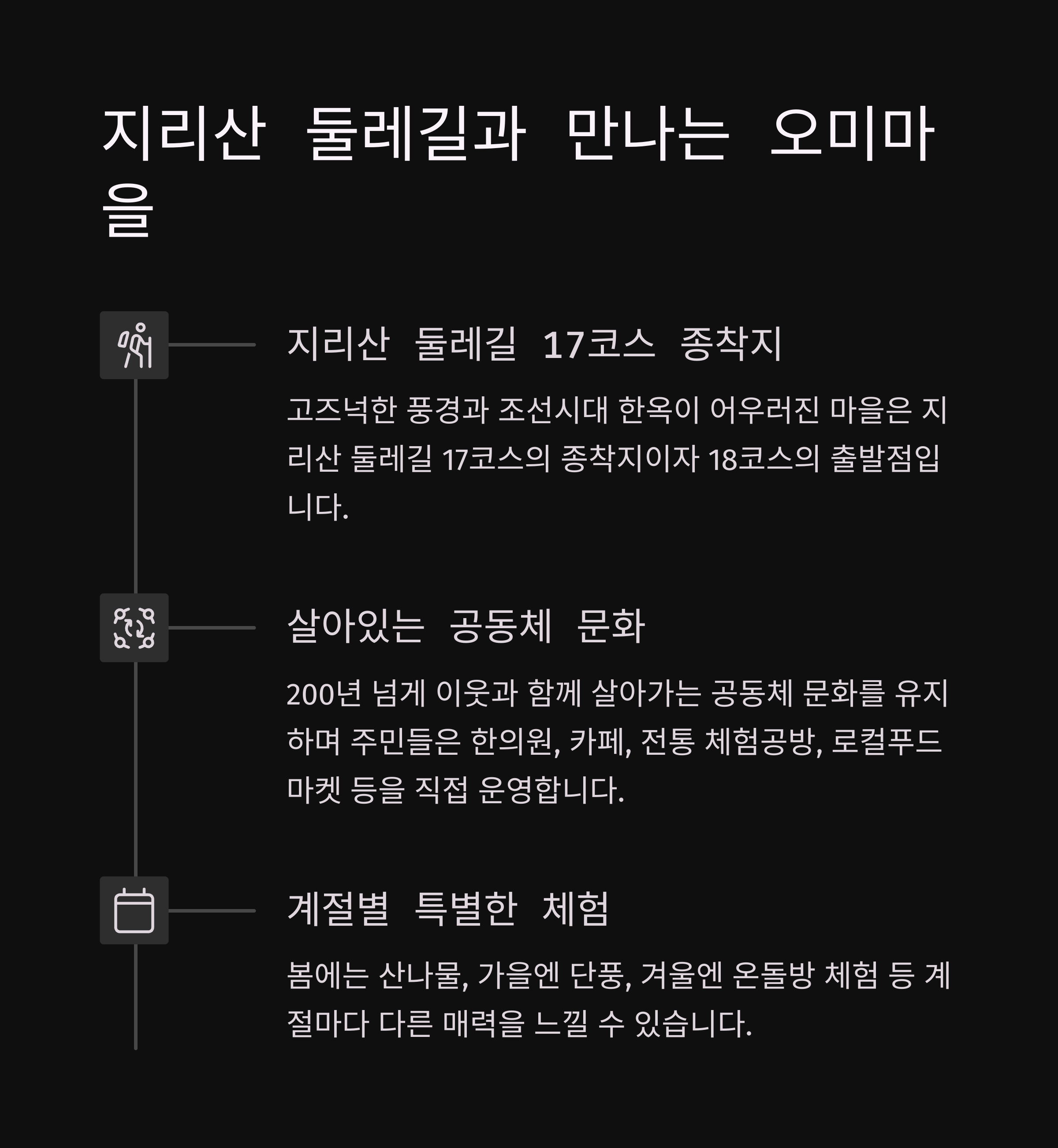 지리산 둘레길을 걷다 보면 만나는 마을, 바로 오미마을이에요. 17코스의 종착지이자 18코스의 출발점인 이곳은, 단순한 쉼터 그 이상이에요. 고즈넉한 풍경과 조선시대 한옥이 어우러진 마을 골목을 걷다 보면, 시간이 천천히 흐른다는 걸 체감하게 되죠. 길게 이어진 돌담길, 나무문을 닫는 소리, 마당에서 들려오는 새소리까지... 걷는 것만으로도 힐링이 됩니다.