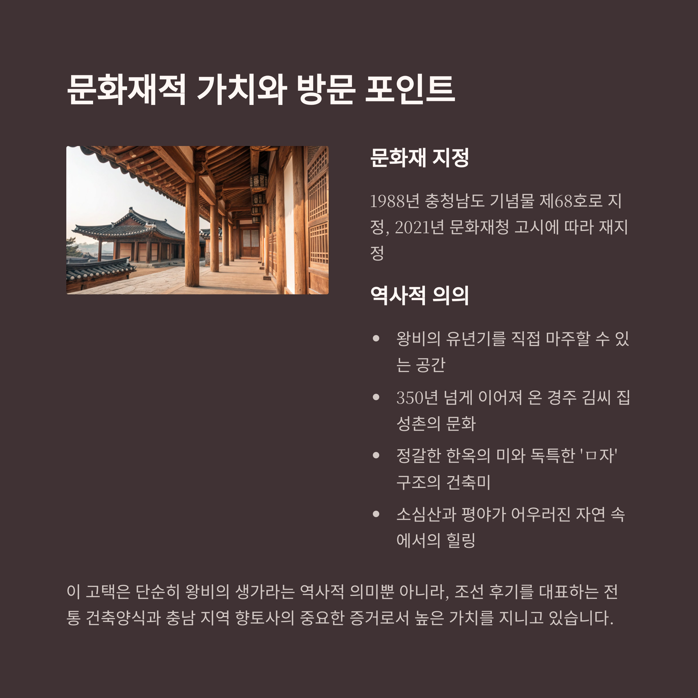 정순왕후 생가는 1988년 충청남도 기념물 제68호로 지정되었고, 2021년에는 문화재청 고시에 따라 다시 재지정되었어요. 현재는 독립운동가 김용환의 아들 김기흥 씨가 소유하고 있다고 알려져 있죠. 이 고택은 단순히 왕비의 생가라는 역사적 의미뿐 아니라, 조선 후기를 대표하는 전통 건축양식과 충남 지역 향토사의 증거로서 높은 가치를 지니고 있어요.