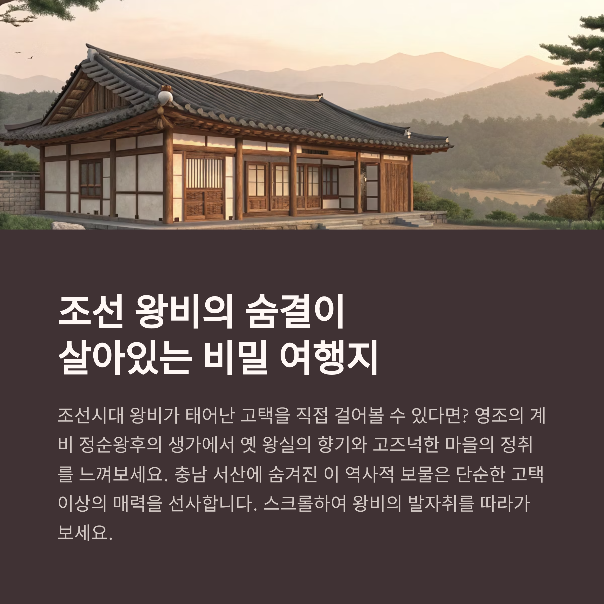 조선시대 왕비가 태어난 그 고택, 직접 걸어본다면 어떤 기분일까요? 옛 왕실의 향기와 고즈넉한 마을의 정취가 어우러진 그곳으로 떠나봅니다.