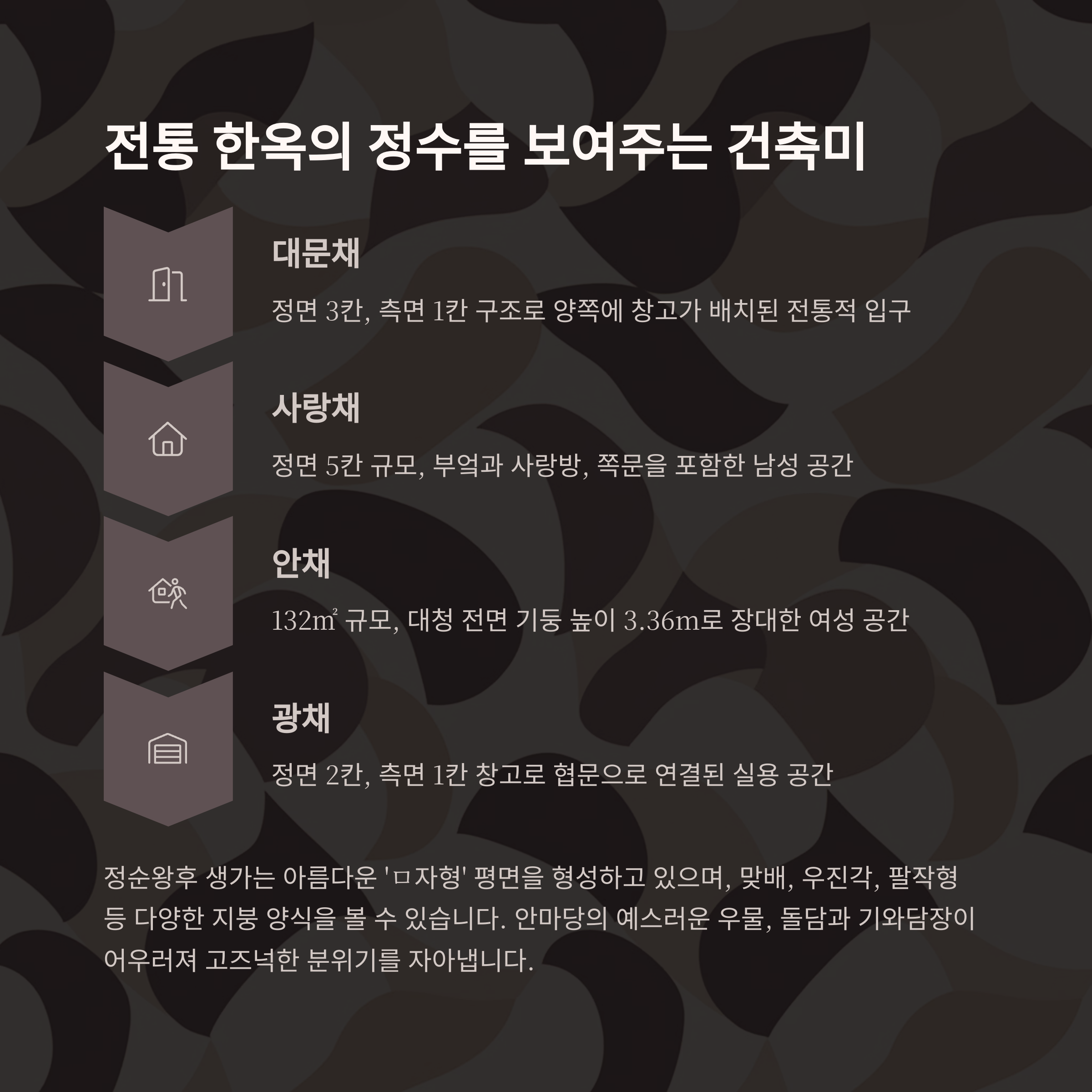 정순왕후 생가는 전통 한옥의 정수를 보여주는 대표적인 고택이에요. 대문채, 사랑채, 안채, 광채로 구성되어 있으며, 안채와 사랑채가 중심이 되어 아름다운 ‘ㅁ자형’ 평면을 형성하고 있습니다.