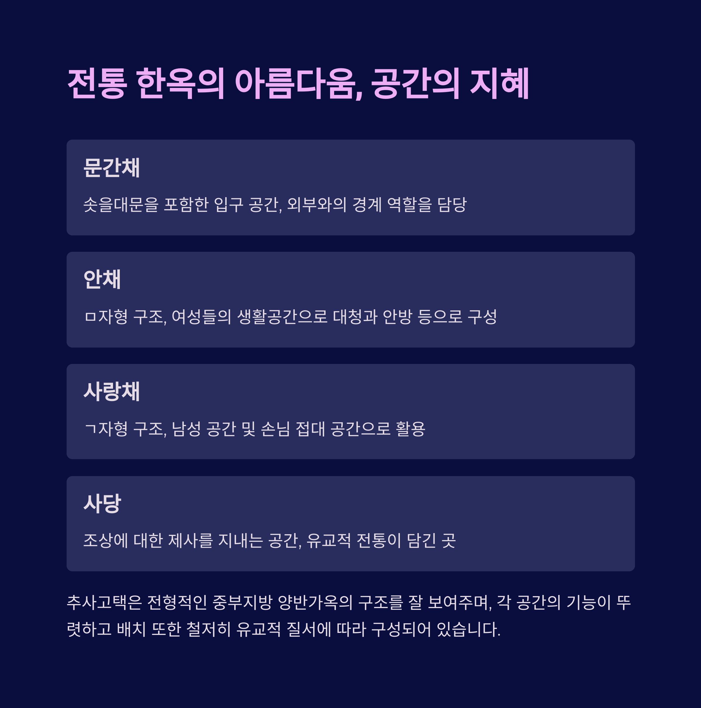 | 안채 | ㅁ자형 구조, 여성들의 생활공간으로 대청과 안방 등 구성 |