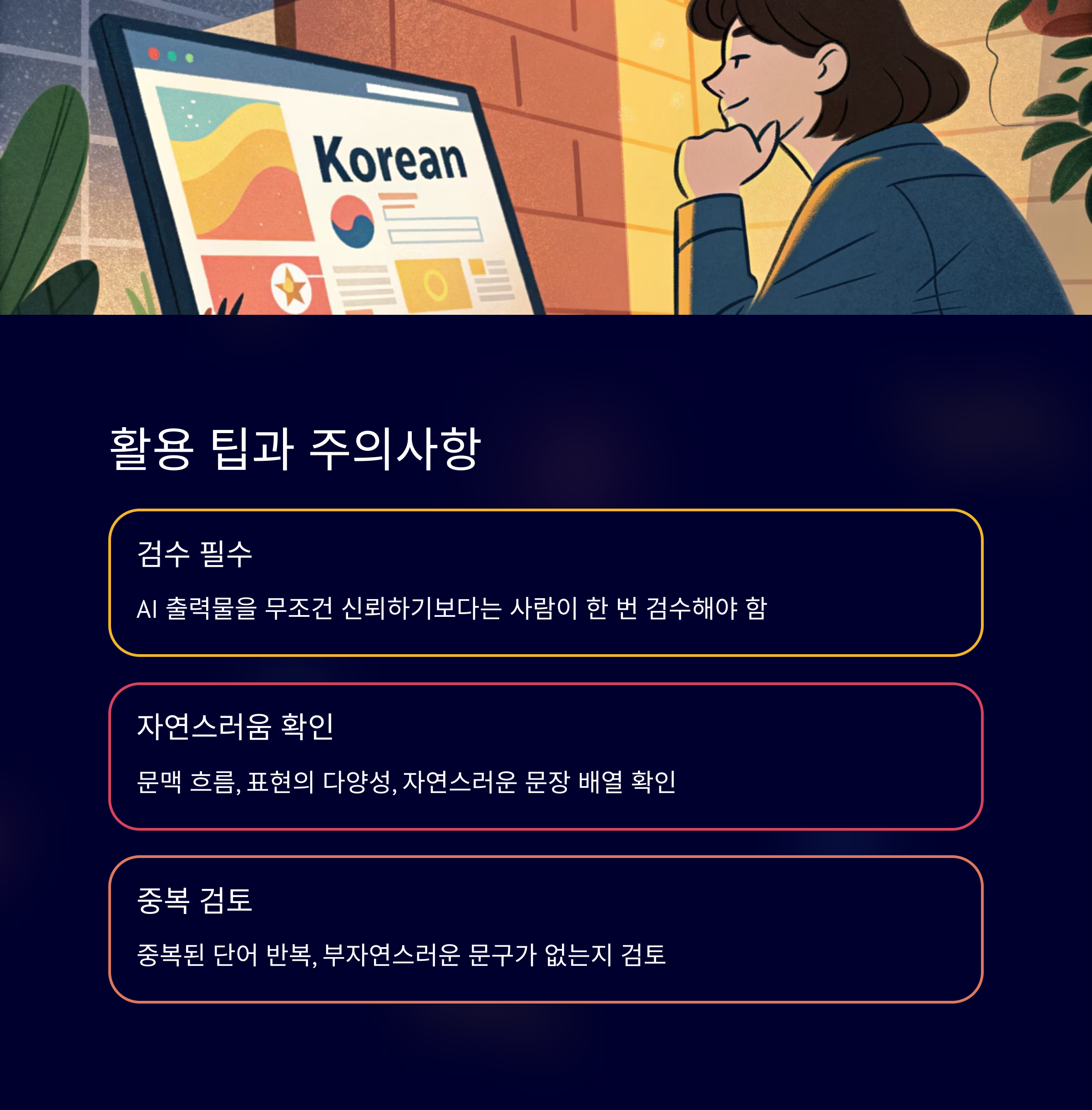 Claude.ai를 잘 활용하면 정말 놀라운 콘텐츠 생산이 가능하지만, 몇 가지 유의할 점도 있어요. 아래 팁들을 참고해보세요.