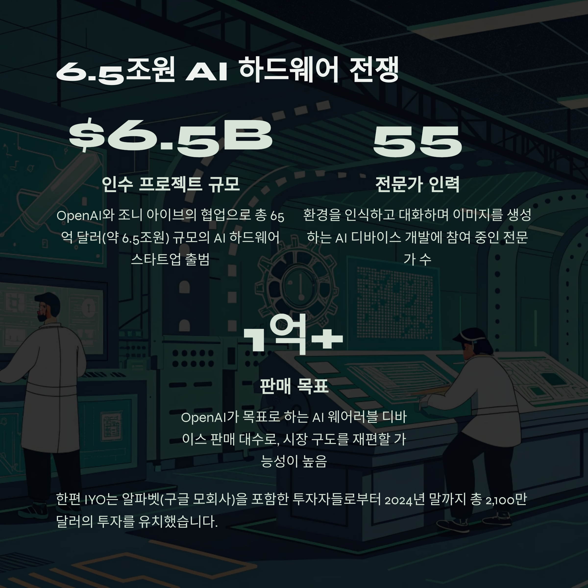 OpenAI는 조니 아이브와 협업해 총 65억 달러 규모의 AI 하드웨어 스타트업을 출범했습니다. 내부 프로젝트명은 공개되지 않았지만, 핵심 목표는 “환경을 인식하고 대화하며 이미지를 생성하는 AI 디바이스” 개발입니다. 55명의 전문가가 참여하고 있으며, 이미 프로토타입도 존재하죠. 1억 대 이상 판매를 목표로 삼은 이 프로젝트는 향후 몇 년간 시장의 구도를 재편할 가능성이 높습니다.
