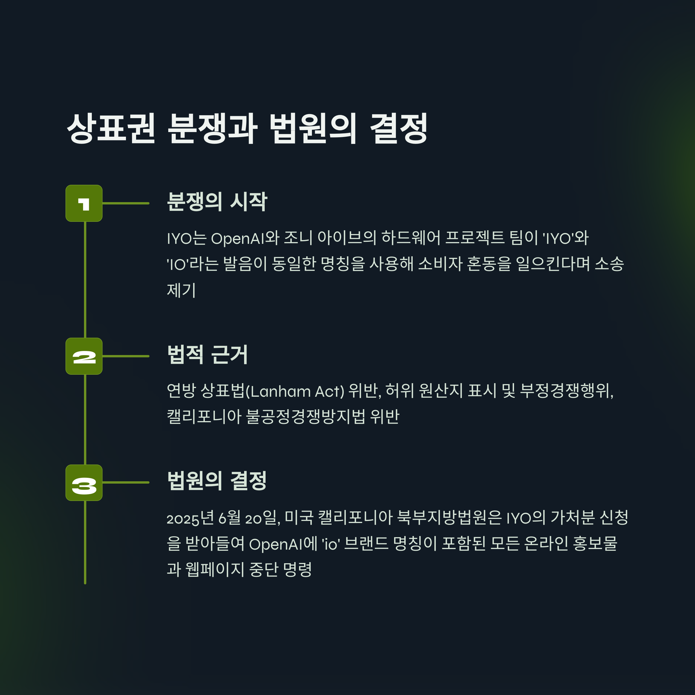 2025년 6월 20일, 미국 캘리포니아 북부지방법원의 트리나 L. 톰슨 판사는 IYO의 가처분 신청을 받아들였습니다. 이 명령에 따라 OpenAI는 ‘io’ 브랜드 명칭이 포함된 모든 온라인 홍보물과 웹페이지를 긴급히 내렸고, 홈페이지엔 “법원 명령에 따라 페이지를 임시 중단했다”는 안내문이 떴죠. 이 판결의 배경은 다음과 같은 법적 판단에 기초합니다.