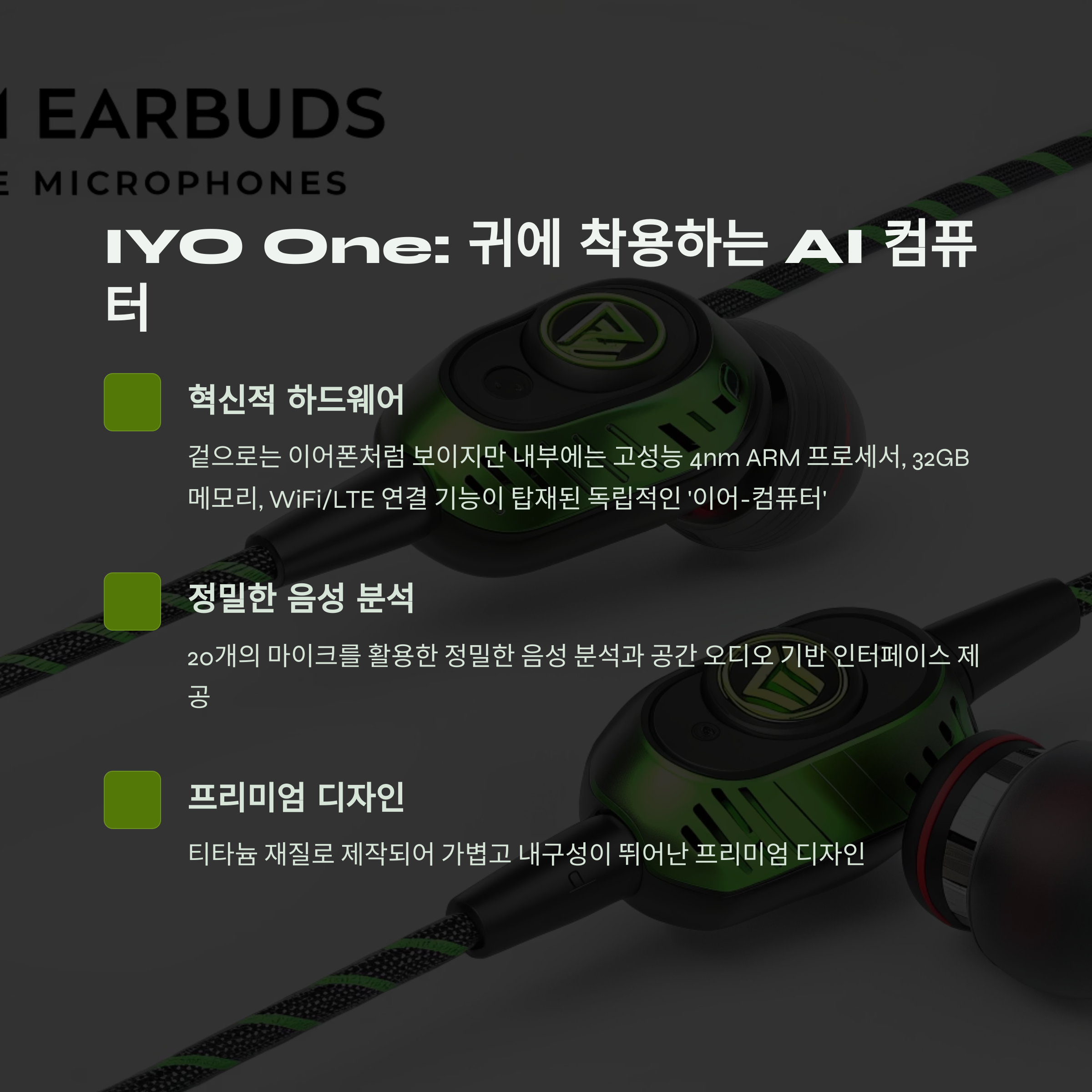 IYO가 내놓은 ‘IYO One’은 기존의 어떤 기기보다도 독창적인 형태의 인공지능 디바이스입니다. 겉으로 보면 일반 이어폰 같지만, 내부에는 고성능 4nm ARM 프로세서, 32GB 메모리, WiFi/LTE 연결 기능까지 탑재되어 있어 독립적인 ‘이어-컴퓨터’로 작동합니다. 이 기기의 핵심은 공간 오디오 기반의 인터페이스와 **20개의 마이크**를 활용한 정밀한 음성 분석 기능에 있어요. 게다가 티타늄 재질로 만들어져 가볍고 내구성도 뛰어나죠.