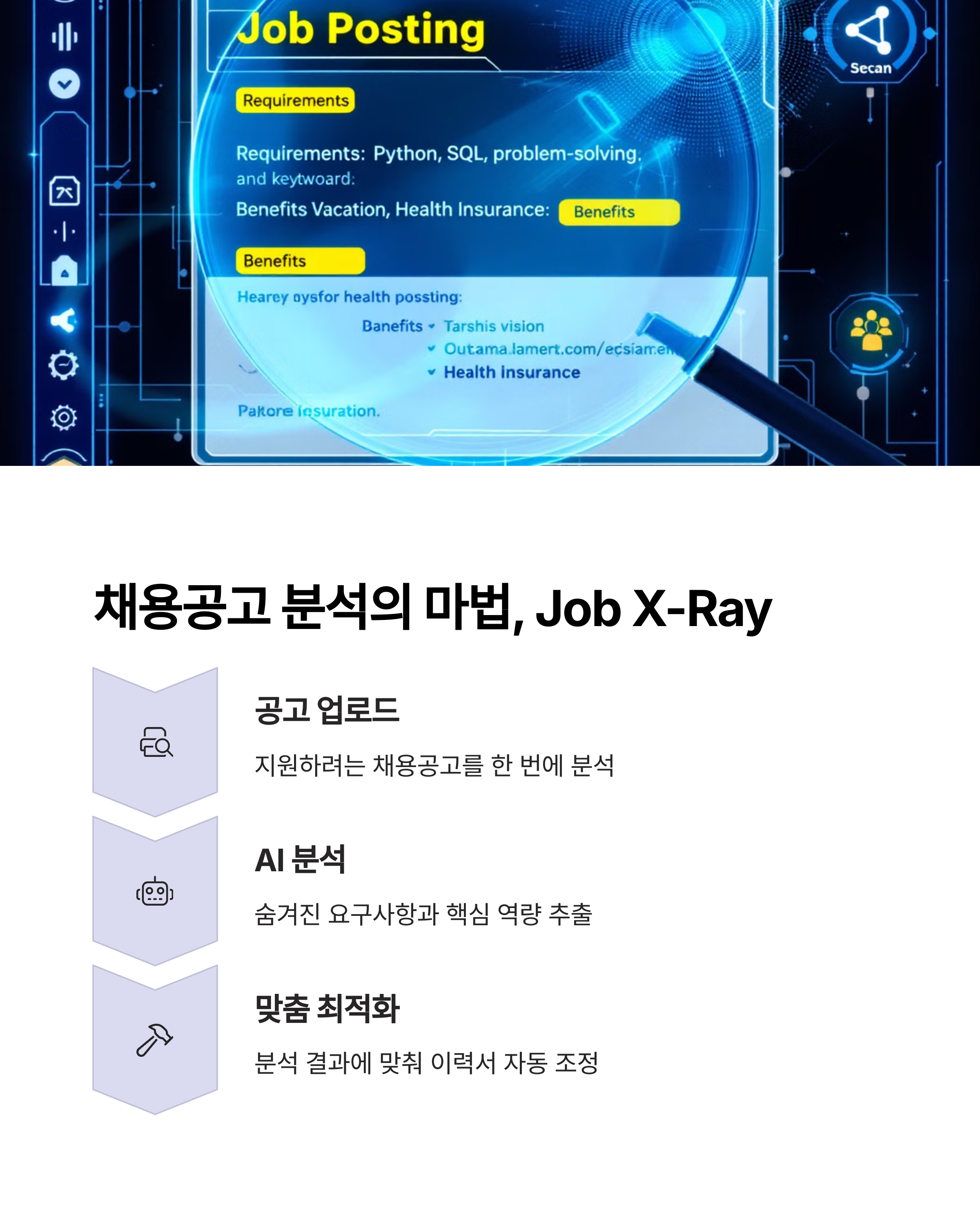 Job X-Ray는 일종의 직무 해부 도구에요. 공고를 그냥 읽는 게 아니라, 그 안에 숨어 있는 핵심 요구사항과 키워드를 AI가 뽑아줍니다. 덕분에 내가 뭘 강조해야 할지 명확해지고, 지원서가 훨씬 전략적으로 바뀌죠.