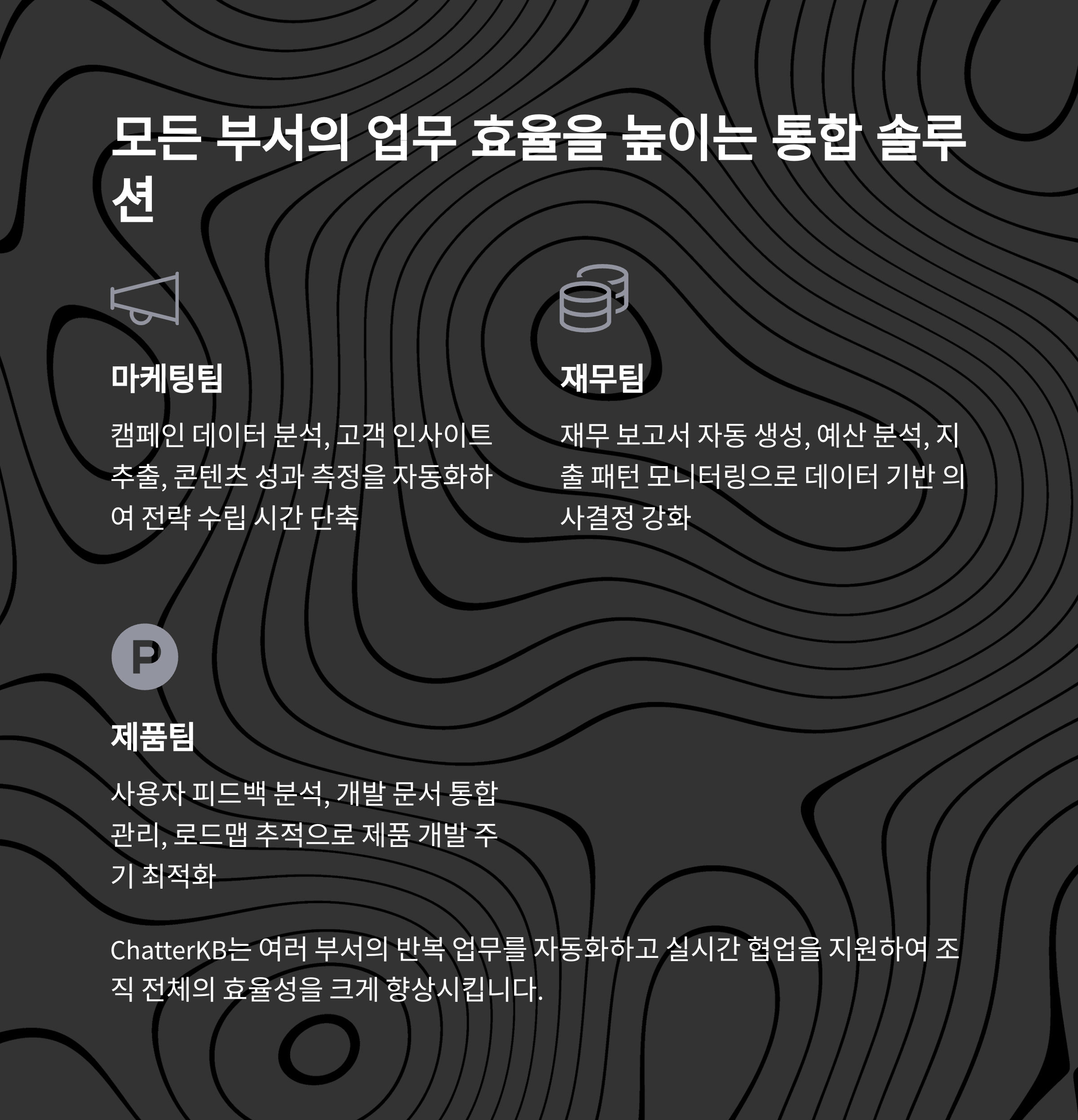 ChatterKB는 전 부서, 다양한 산업 분야에서 적용 가능해요. 특히 마케팅, 재무, 제품, 이커머스 분야에서의 활용도가 정말 높습니다. 예를 들어 마케팅팀은 캠페인 성과 분석을 자동화하고, 제품팀은 고객 피드백을 실시간으로 분석하죠. 아래 표는 주요 부서별 실제 사용 예시를 정리한 것입니다.
