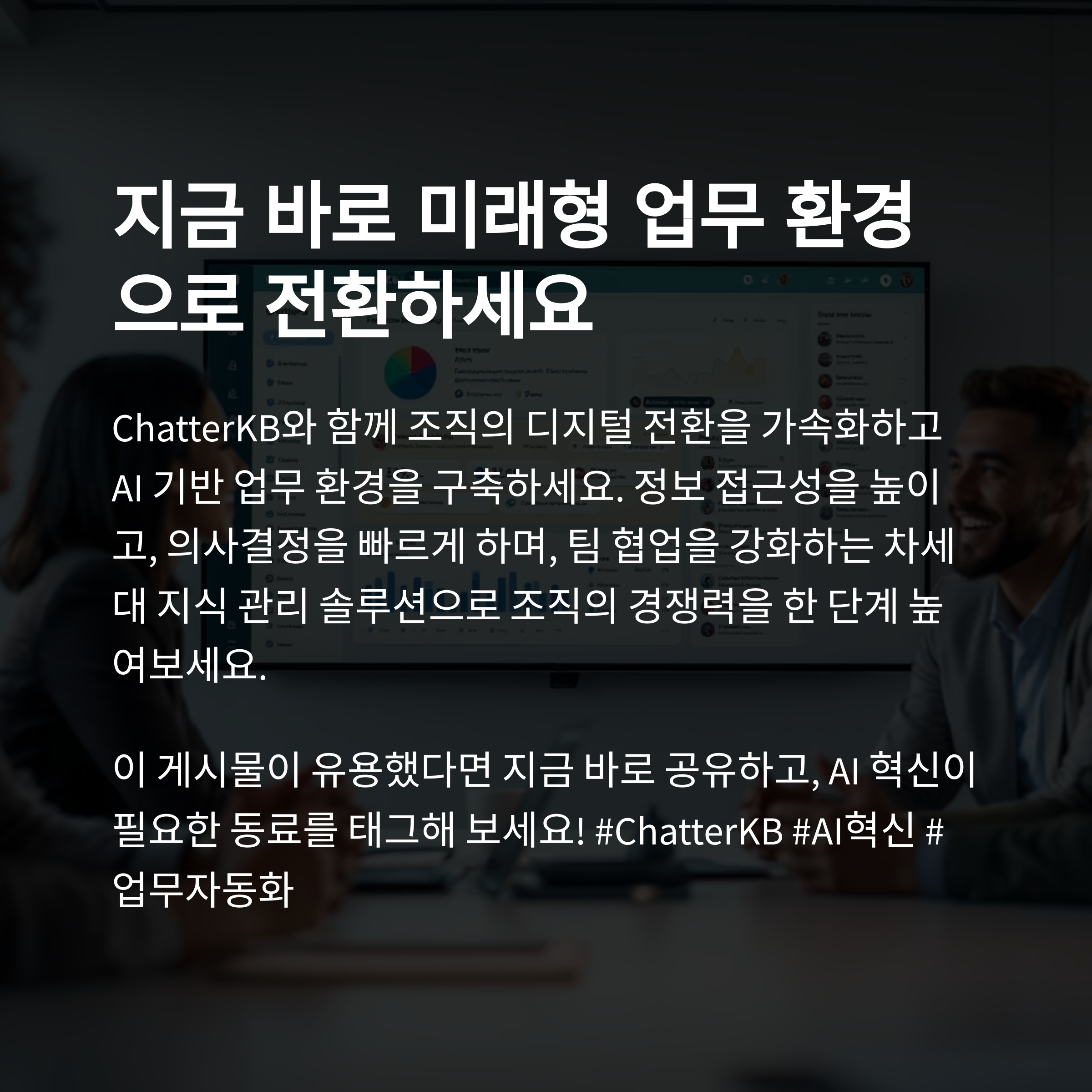 지금 우리가 일하는 방식, 정말 이대로 괜찮을까요? 저는 ChatterKB를 경험하면서 진심으로 놀랐고, 다시는 이전으로 돌아가고 싶지 않다는 생각이 들었어요. 정보 찾느라 버리는 시간, 중복되는 리포트 작성, 팀 간의 커뮤니케이션 단절… 모두 ChatterKB가 해결해줬거든요. 아직 도입을 망설이고 계신다면, 우선 무료 체험부터 시작해보세요. 직접 써보면 왜 사람들이 열광하는지 바로 알 수 있을 거예요. 😊 여러분도 더 똑똑하고 효율적인 업무 환경을 만들어보세요. ChatterKB와 함께라면 가능합니다!