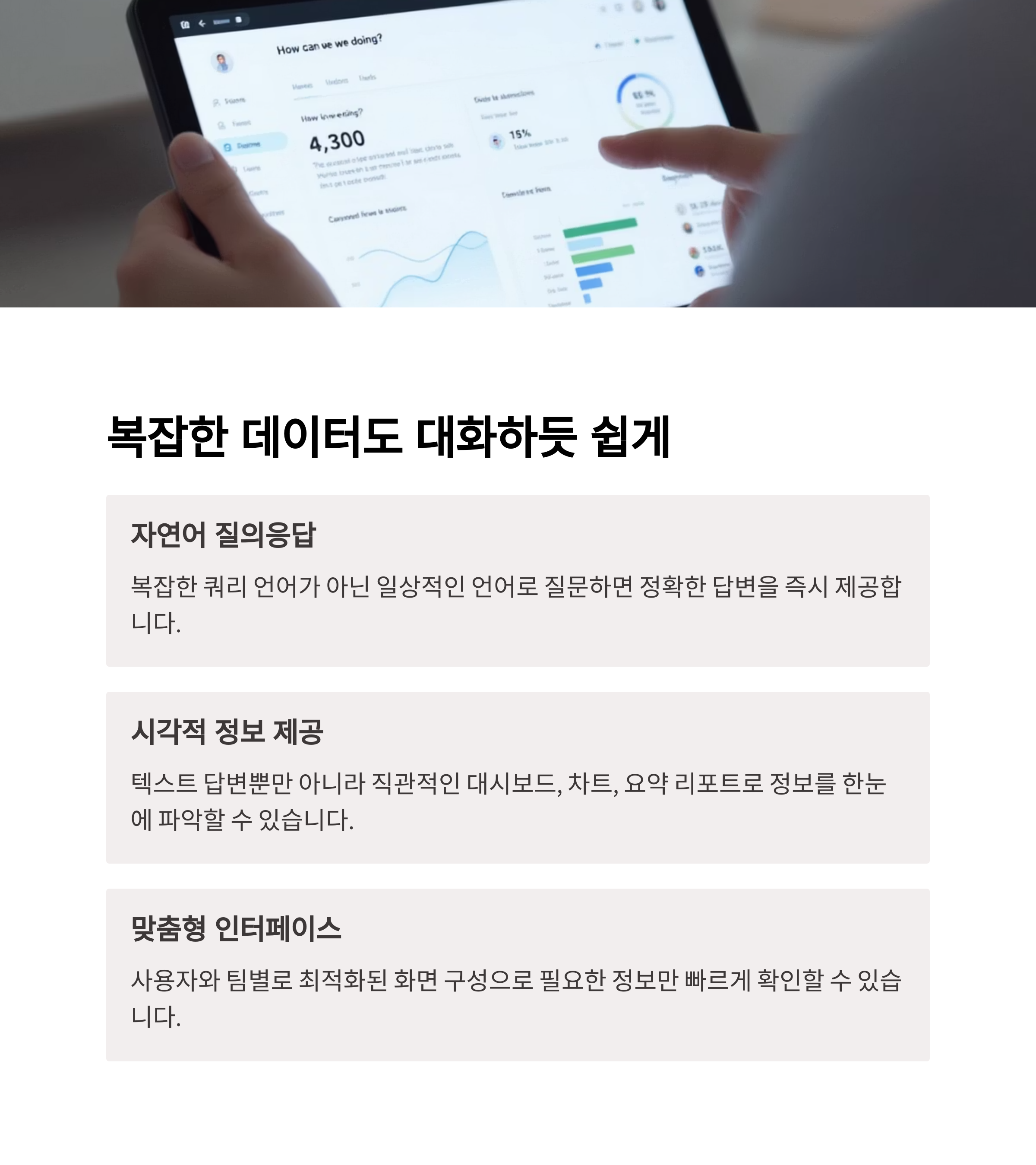 "3월 캠페인 성과 알려줘", "이번 주 고객 피드백 정리해줘"처럼 말하듯 질문하면 됩니다. 사용자의 말투나 뉘앙스를 잘 인식해서 맥락에 맞는 답변을 제공하죠.