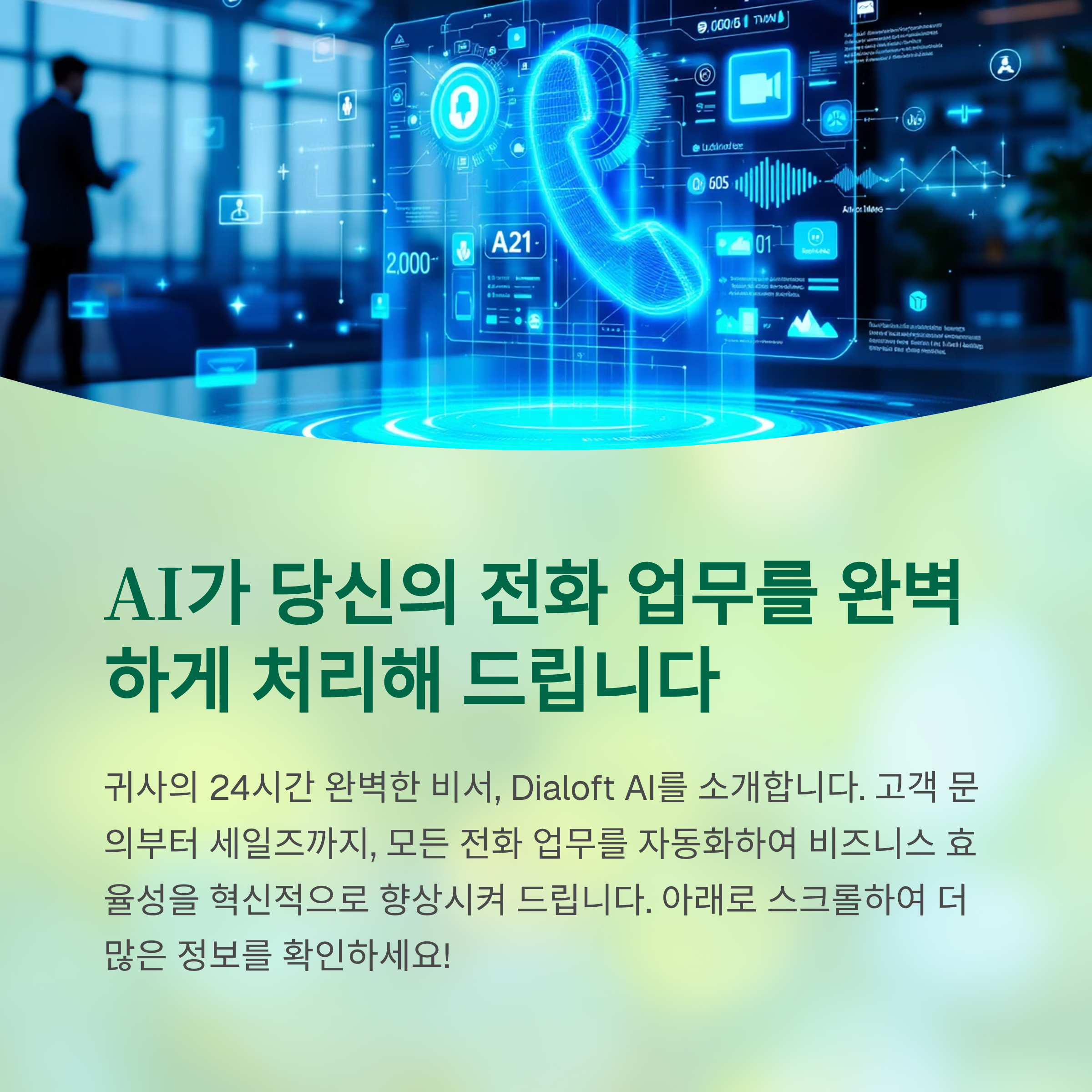 전화 업무는 여전히 기업의 중요한 커뮤니케이션 채널입니다. 하지만 이제는 AI 기술로 훨씬 더 효율적이고, 더 스마트하게 운영할 수 있는 시대죠. Dialoft AI는 단순한 도구가 아닌, 비즈니스 운영 방식을 혁신하는 파트너가 될 수 있습니다. 실제로 사용해보면 ‘이걸 왜 이제야 알았지?’ 싶은 순간이 분명히 올 거예요. 여러분도 전화 자동화의 미래를 직접 체험해보세요!