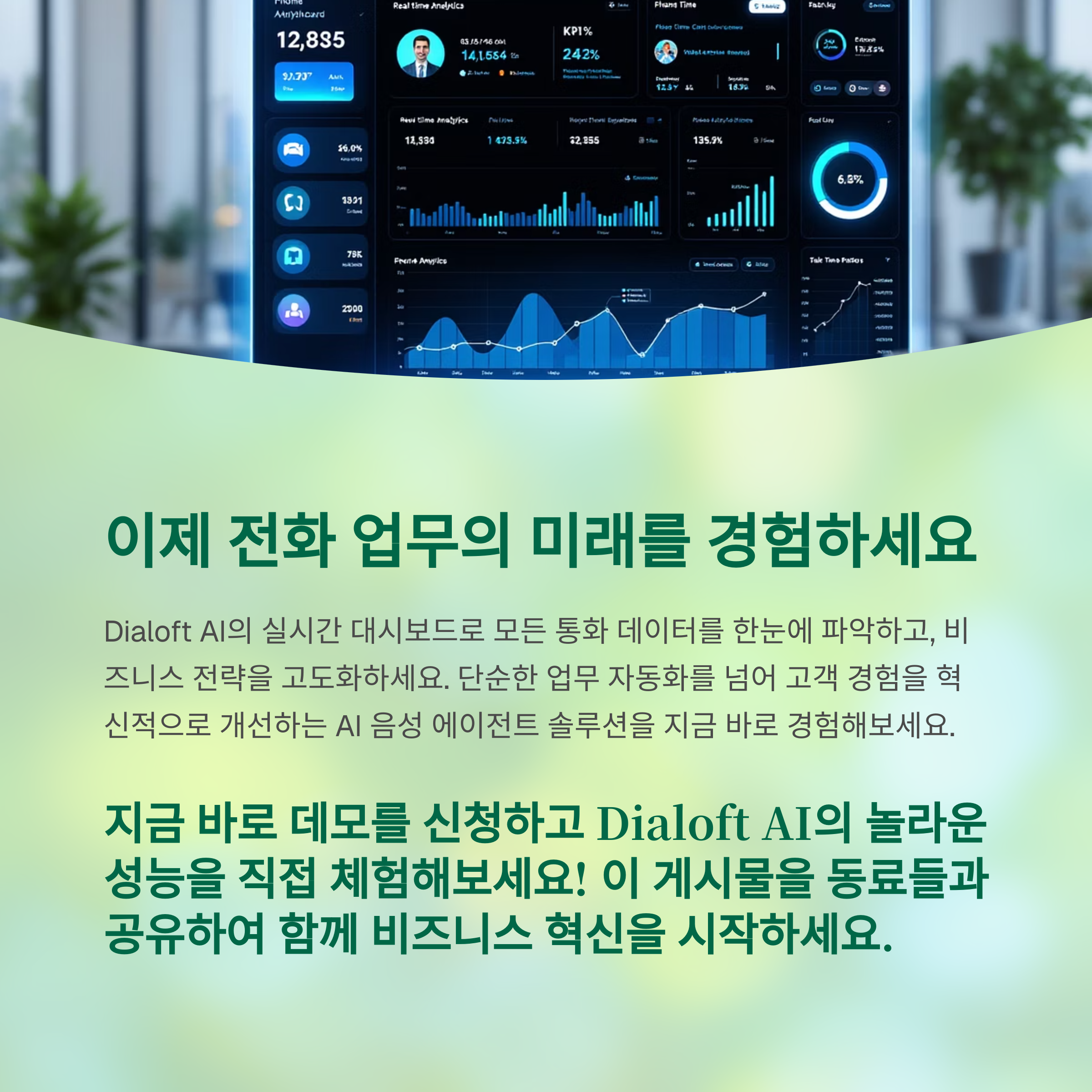 전화 업무는 여전히 기업의 중요한 커뮤니케이션 채널입니다. 하지만 이제는 AI 기술로 훨씬 더 효율적이고, 더 스마트하게 운영할 수 있는 시대죠. Dialoft AI는 단순한 도구가 아닌, 비즈니스 운영 방식을 혁신하는 파트너가 될 수 있습니다. 실제로 사용해보면 ‘이걸 왜 이제야 알았지?’ 싶은 순간이 분명히 올 거예요. 여러분도 전화 자동화의 미래를 직접 체험해보세요!