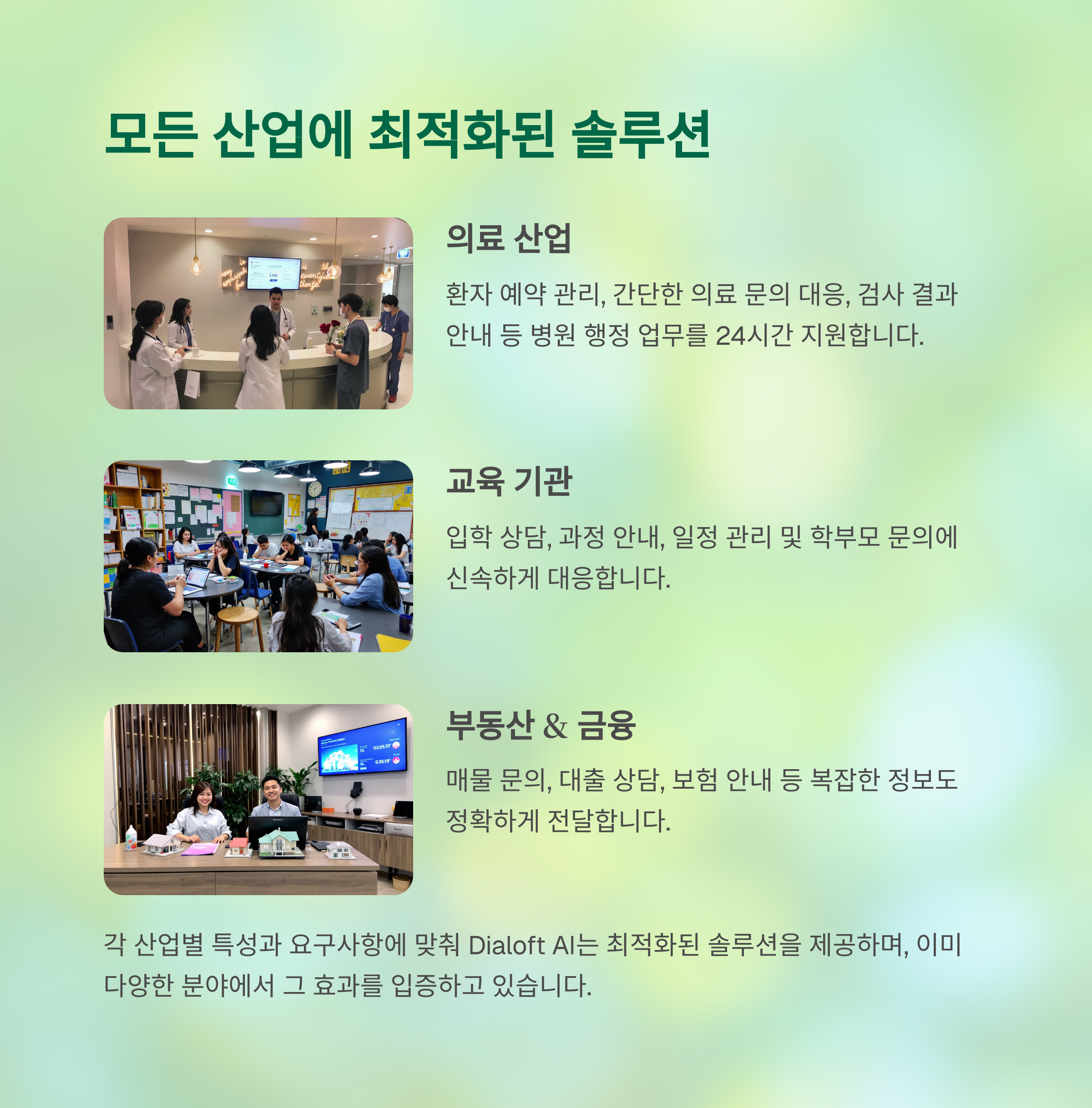 Dialoft AI는 특정 산업에 국한되지 않고 다양한 분야에서 널리 활용될 수 있습니다. 다음은 그 대표적인 사례들이에요.