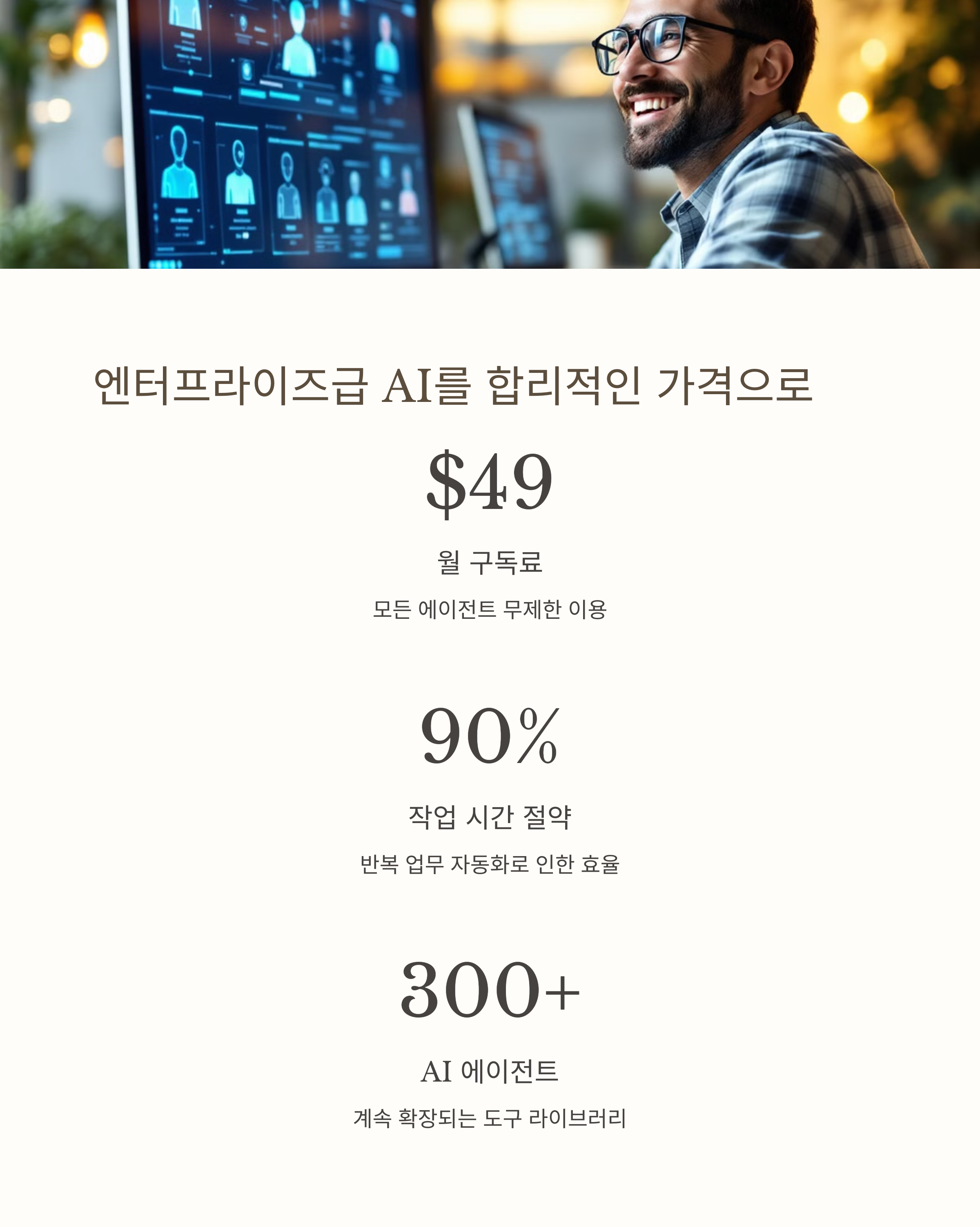| 무제한 구독 | $49/월 | 300+ 에이전트 무제한 사용, 지속 업데이트, 산업별 솔루션 제공 |
