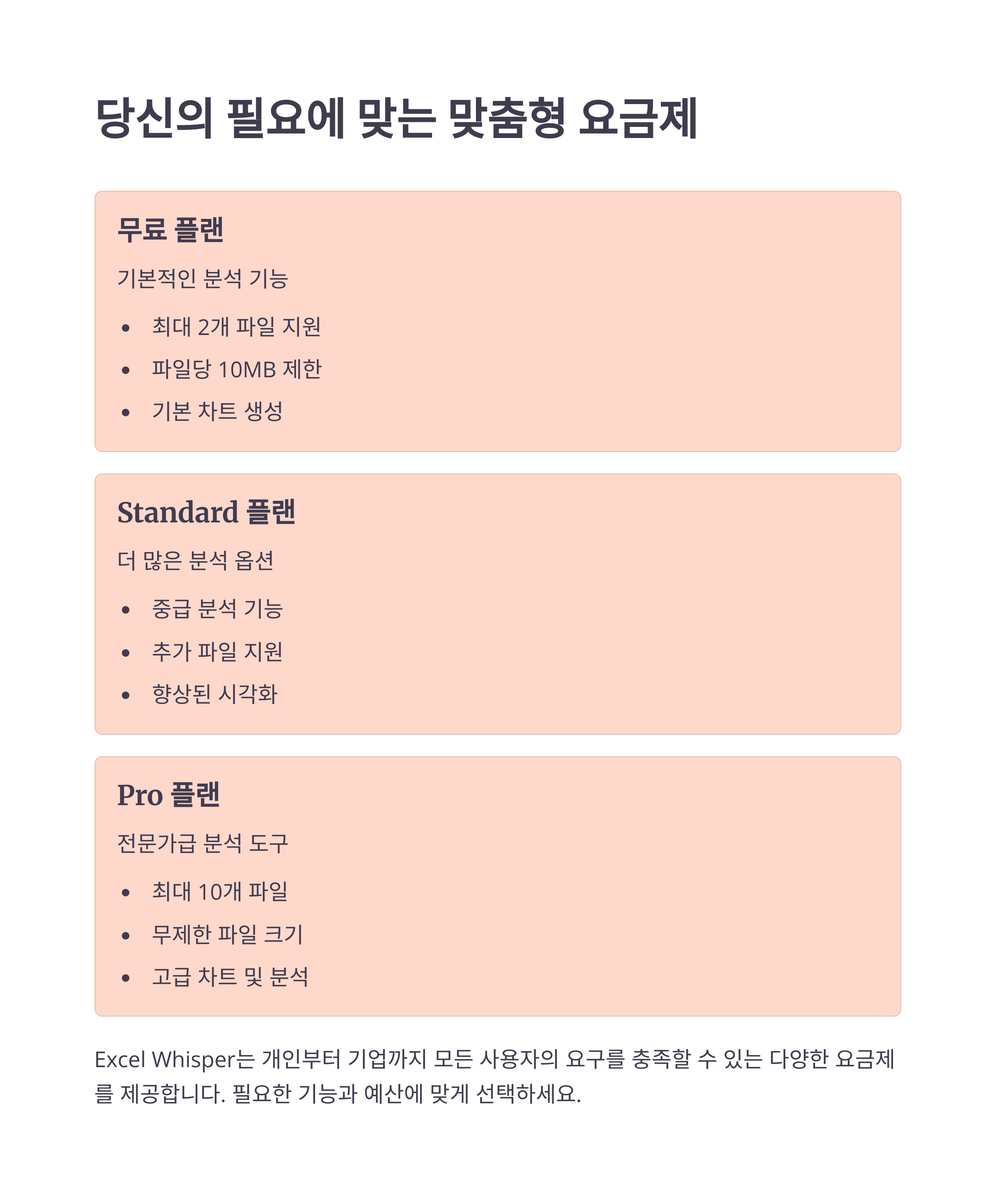 Excel Whisper는 세 가지 요금제를 제공하고 있어요. 솔직히 무료 플랜만 써도 꽤 괜찮지만, 진짜 맛은 Pro 플랜에 있더라구요. 한번 표로 정리해봤어요: