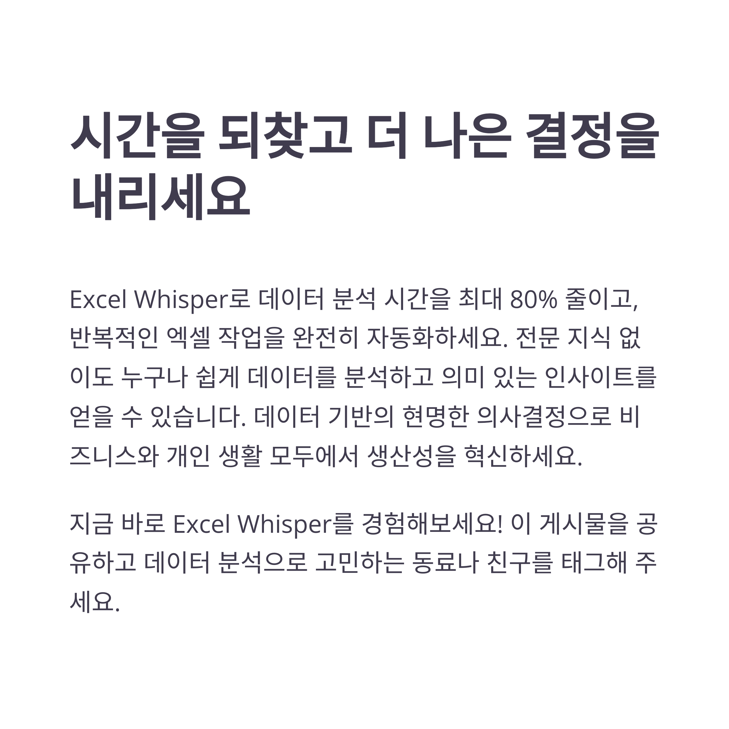 오늘 함께 알아본 Excel Whisper, 어떠셨나요? 저는 이 도구 덕분에 엑셀 앞에서 한숨 쉬던 시간이 눈에 띄게 줄었어요. 매번 머리를 싸맸던 복잡한 정리와 분석 작업이 이제는 클릭 몇 번, 문장 하나로 해결되니까요. 혹시 여러분도 데이터 작업이 두렵거나 귀찮았다면, Excel Whisper를 한 번 꼭 써보세요. 분명 새로운 세상이 열릴 거예요. 여러분의 데이터 활용 이야기도 댓글로 들려주세요! 우리 같이 성장해봐요. 😊
