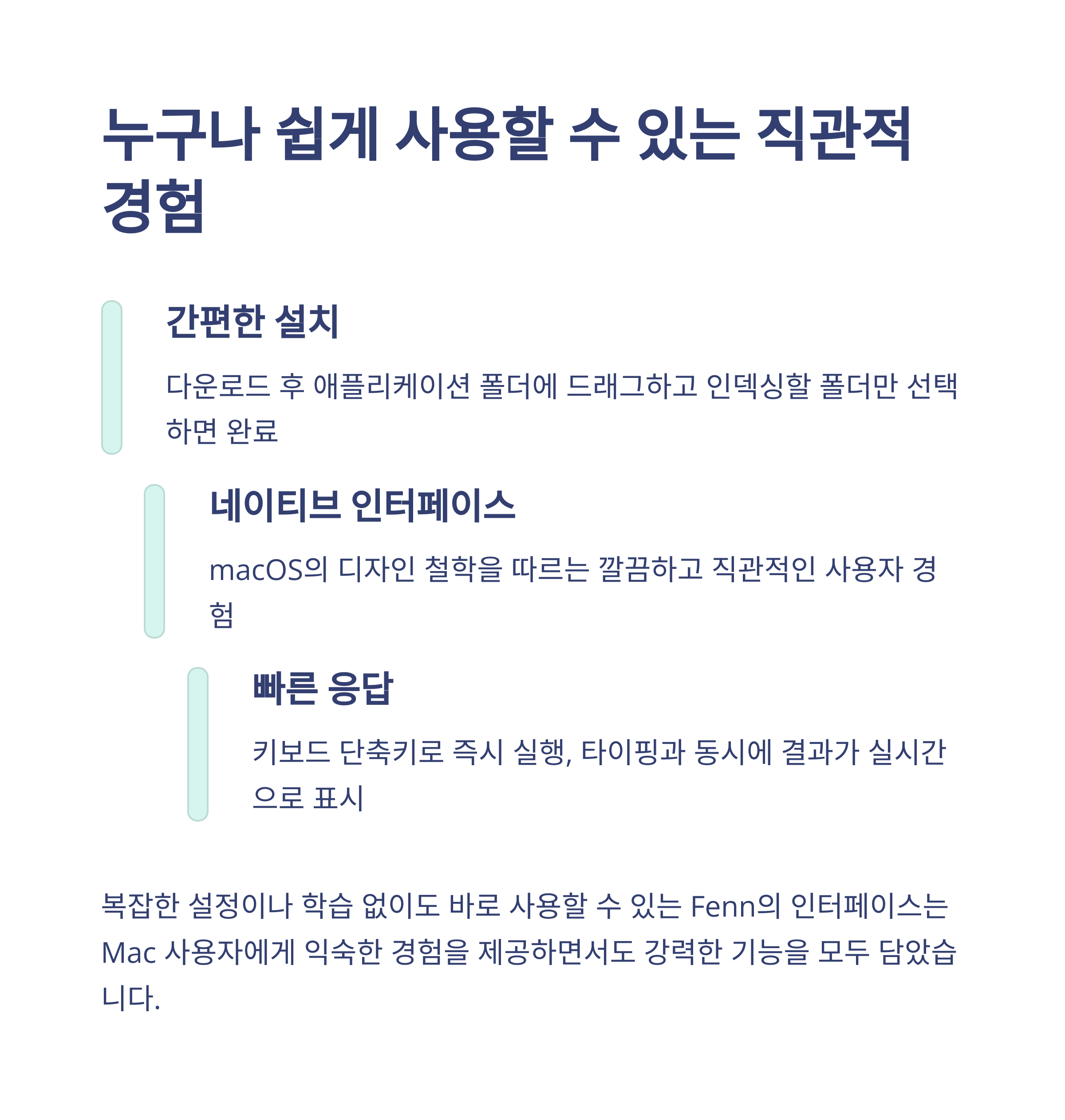 솔직히 말해서 요즘은 정보가 너무 많아서 오히려 찾기가 더 어려워요. 특히 Mac에서는 파일이 많을수록 정리도 힘들고, 검색도 제한적이죠. 예전엔 '어디에 저장했더라...' 하며 수십 분씩 Finder를 헤매던 저였는데요, Fenn을 만나고 나서는 그런 일이 없어졌습니다. 단순히 파일명을 검색하는 게 아니라, 문서나 이미지 속 '내용'을 기준으로 검색해주는 덕분이에요. 특히 학습 자료나 프로젝트 폴더가 복잡하게 얽혀 있는 경우, Fenn은 진짜 구세주 같아요.