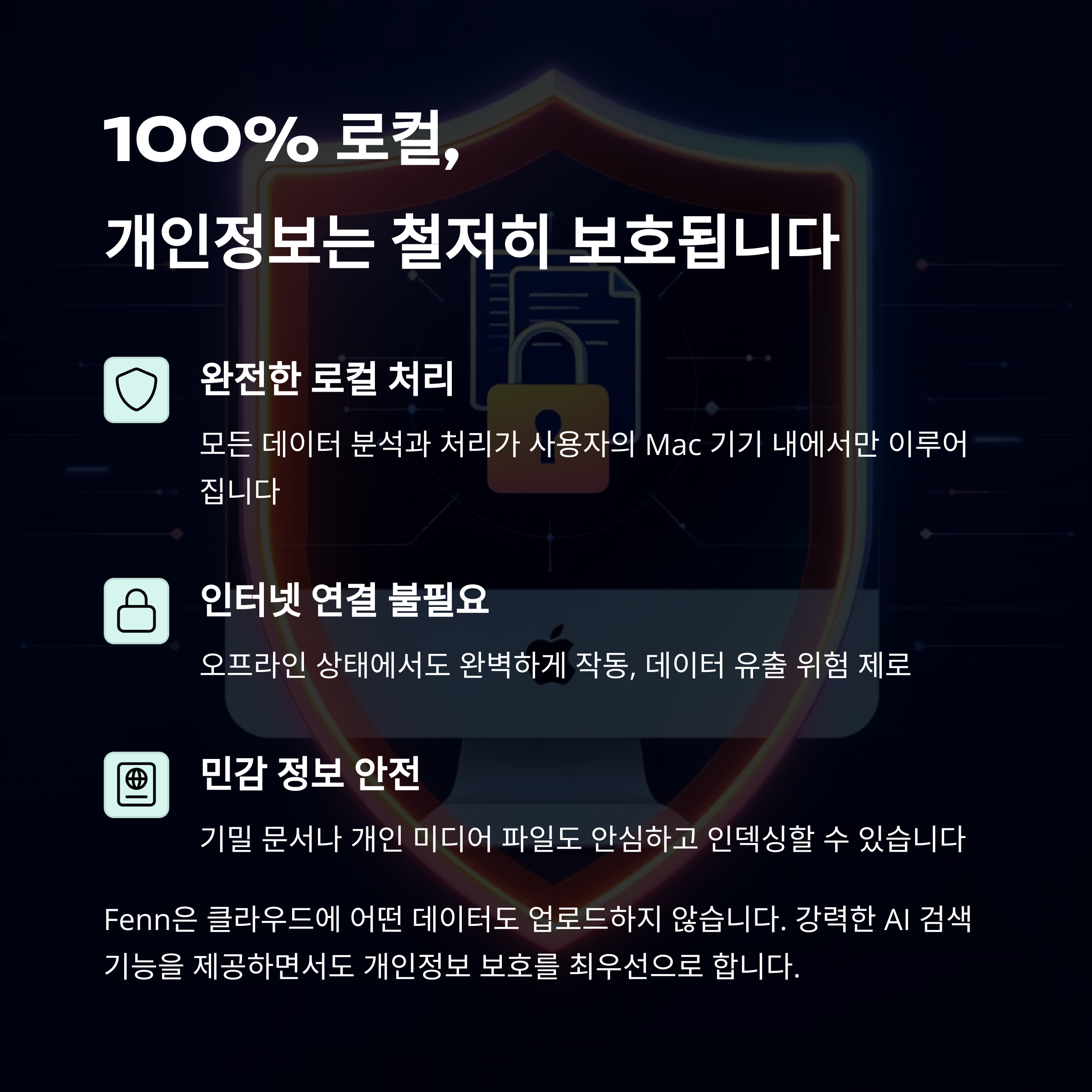 Fenn은 오직 로컬에서만 작동하며, 클라우드 업로드 없이 개인 정보를 완벽히 보호합니다.
