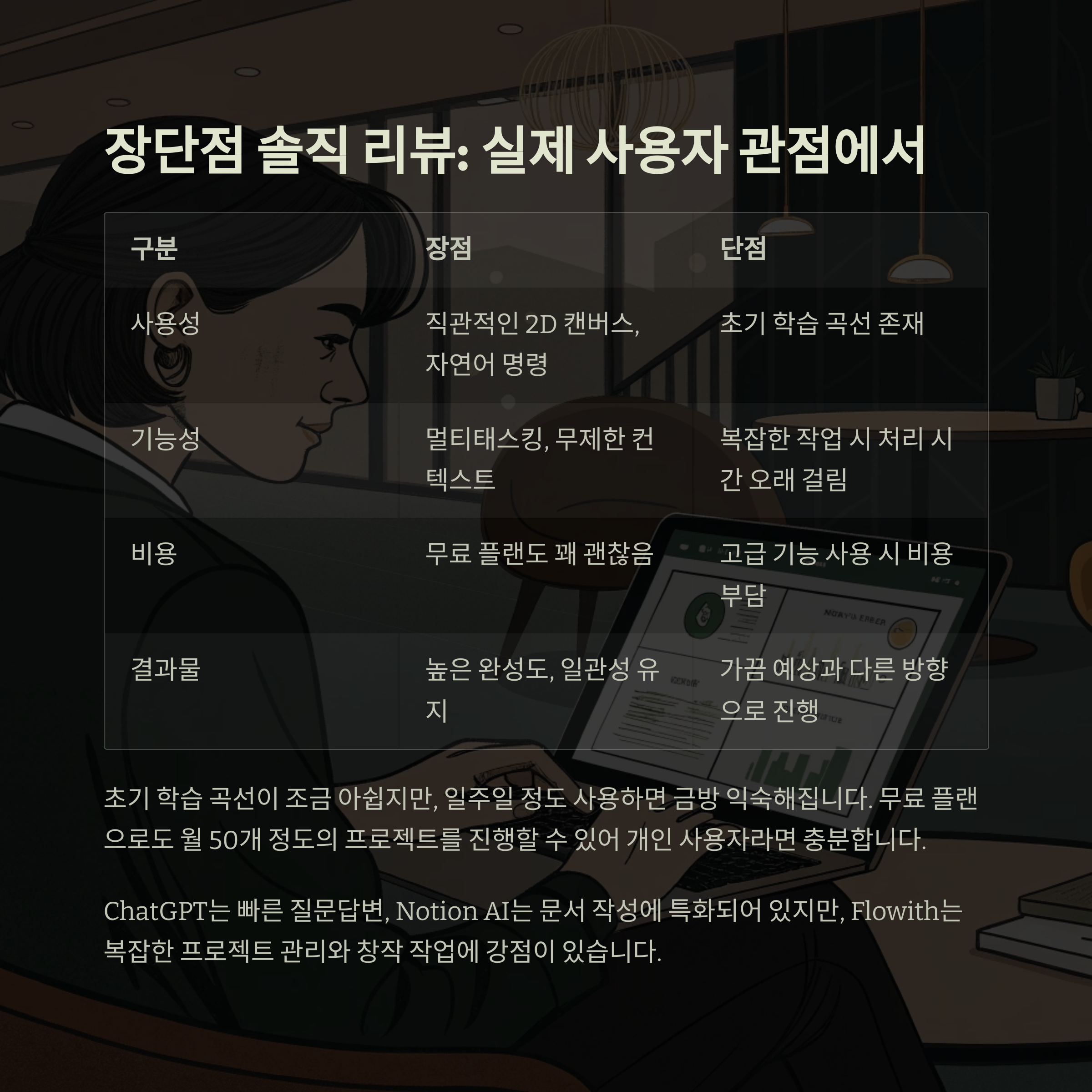 ChatGPT는 대화형 AI로는 최고지만, 복잡한 프로젝트 관리나 동시 작업에는 한계가 있어요. Notion AI는 문서 작성에 특화되어 있지만, 창작이나 자동화 측면에서는 아직 부족하고요. 반면 Flowith는 이 모든 걸 한 번에 해결해주는 느낌이에요.
