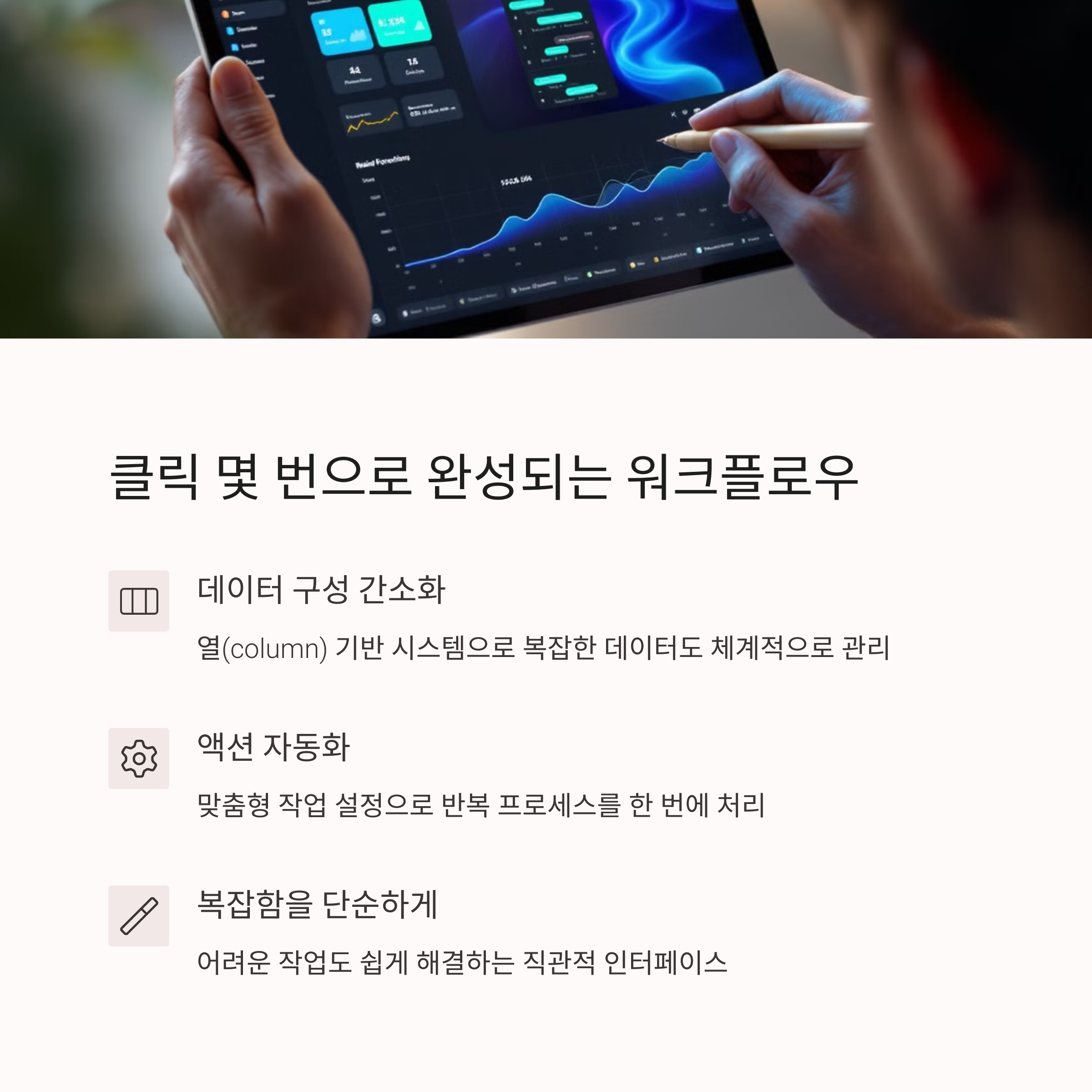 | 워크플로우 설계 | 열과 작업(action)을 조합해 손쉽게 자동화 설계 |